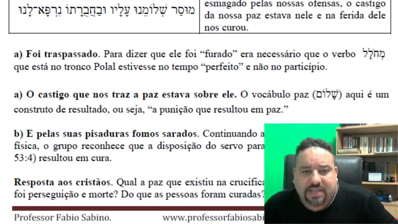 magado Pelas nossas ofensas o castigo da nossa paz estava nele e na ferida dele nos curou Esse é o sentido interlinear tá com algumas análises dos vocábulos a expressão foi traspassado para dizer que ele foi furado que alguns entendem traz passado no sentido de furar né é o que algumas pessoas entendem é o que é uma versão em português relata traz passado outras traz ferido tá vamos lá para dizer que foi furado era necessário que o verbo merol merol merol que está no tronco polar aí a pessoa tem que ter um pouquinho de gramática hebraico