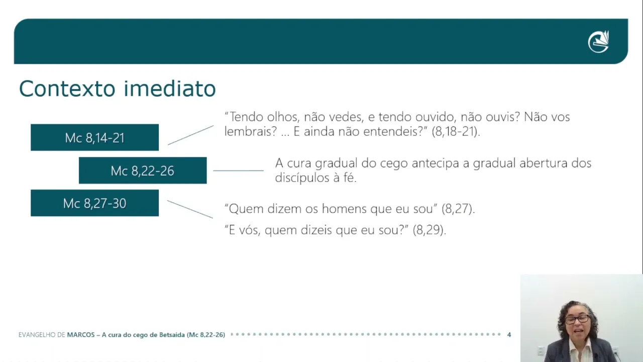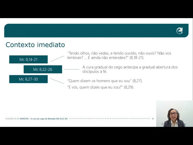 [Música] Olá na aula de hoje nós iremos estudar a narrativa da Cura do Cego de beider Marcos 8 Versículos 22 e 26 eh olhando aqui a estrutura da sessão do caminho nós veremos que a narrativa da Cura do Cego de bside está situada logo no início do Caminho de Jesus a Jerusalém n Logo no início vai acontecer esta cura de cegueira em betsaida a essa cura de cegueira corresponde uma outra cura de cegueira que é situado no final do caminho quando Jesus está Jesus está eh prestes a entrar em Jerusalém lá no final nós temos