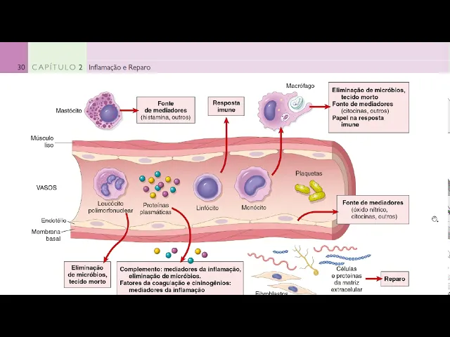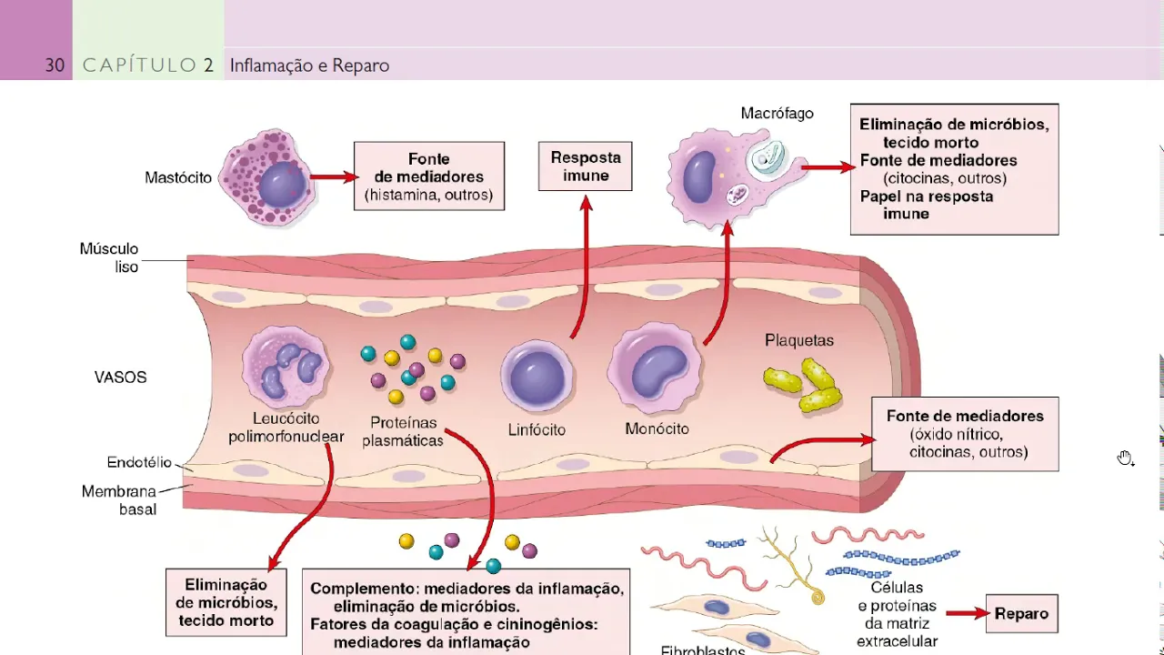 leu postos vasos sanguíneos então não tem como pensar em inflamação sem vaso sanguíneo são os vasos sanguíneos que transportam as células de defesas i i nos vasos sanguíneos você é muito importante para entender e interpretar como que acontece a inflamação várias proteínas serve várias proteínas o que vão mediar esse todo esse complexo mecanismo de resposta certo o e outros mediadores outras substâncias químicas que também vão participar é destinado a eliminar a causa inicial da lesão bem como as células e tecidos necróticos que resultam da lesão original e iniciar o processo de reparo então na definição