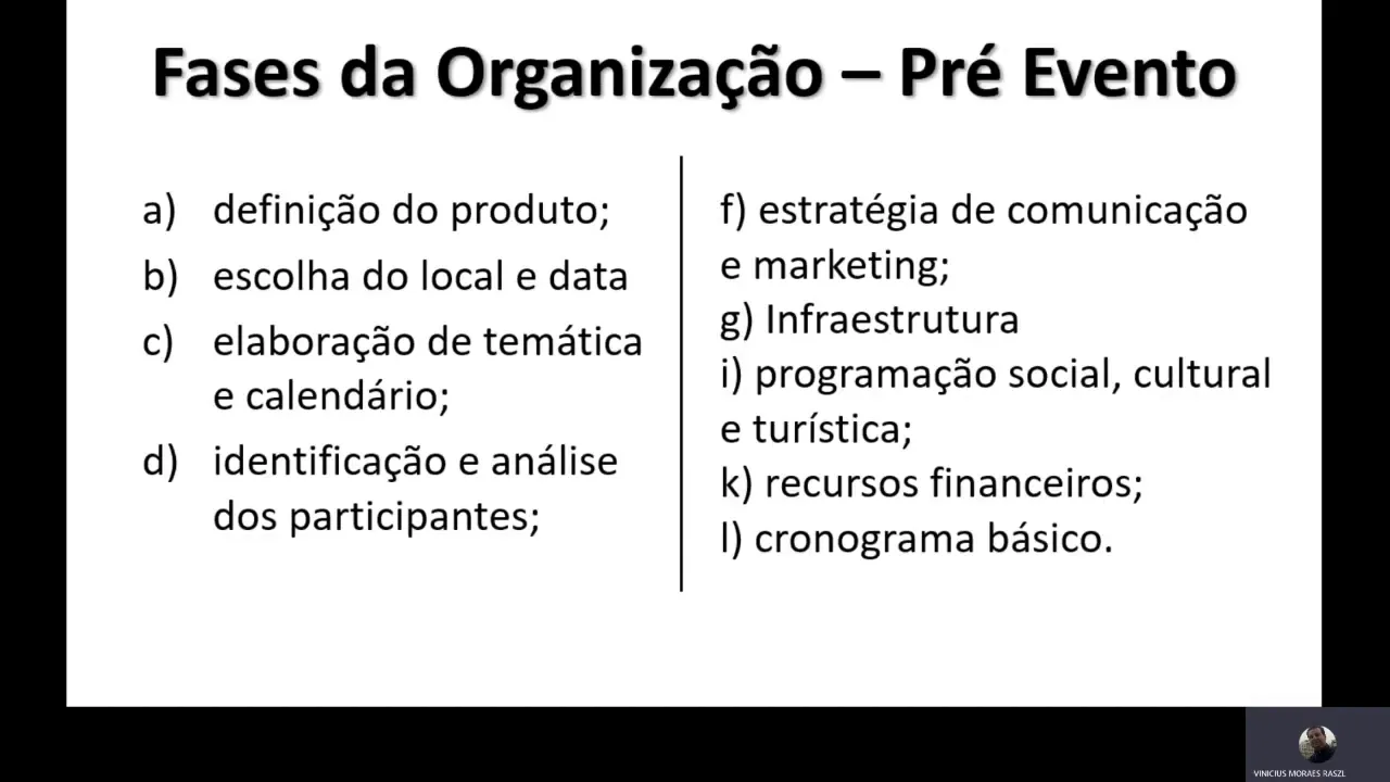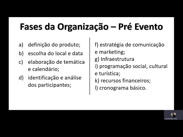 Se tiverem curiosidade procura aí no Google aí né tipologia de eventos tá lá no buscador coloca aí que apareceu um monte de sites que falam sobre essas tipologias sobre essa tipologia né sobre os tipos de eventos E aí e a gente costuma dizer pedir dividir os eventos em três fases principais da sua organização transferir o pré-evento que é tudo que se faz antes do início efetivo do evento no início da organização efetiva no exemplo então é que vai fazer todo levantamento inicial para começar a organização então o evento vai contar definição do produto né entenda