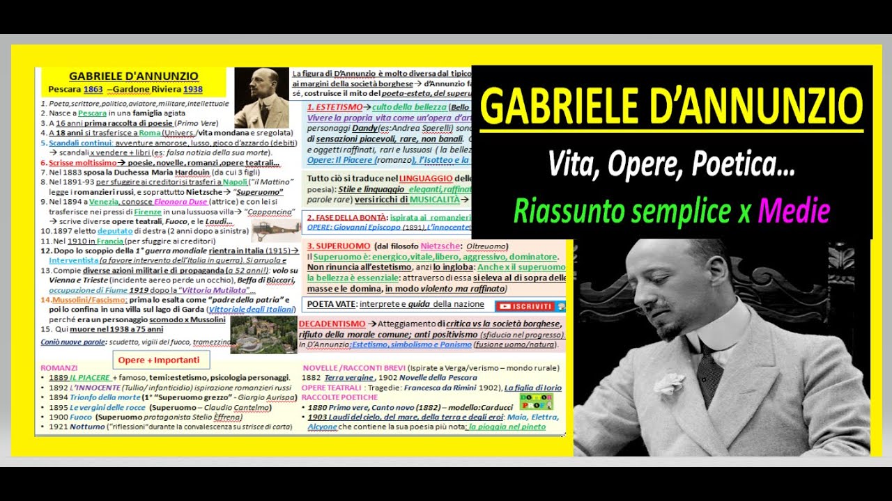 Ciao a tutti in questo video facciamo un riassunto Il più breve ed esaustivo possibile sulla vita le opere e la poetica di D'Annunzio Ma siccome le cose da dire sarebbero tantissime vi lascio anche queste altre slide che vi aiutano a riassumere schematizzare la mole di pagine che sicuramente avrete sui vostri manuali e Iniziamo dalla vita che nel caso di D'Annunzio è molto molto importante Infatti dannose non è stato solo un poeta uno scrittore ma anche un politico un aviatore un militare uno degli intellettuali più importanti della sua epoca nacque a Pescara nel 1863 in una