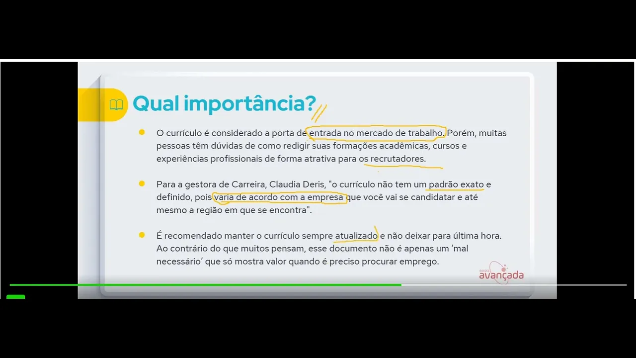 Olá seja muito bem-vindo à nossa segunda aula do curso de elaboração de currículo aqui do escola avançado então vamos aqui passar aqui os nossos C se minutinhos falando de um assunto bem importante hoje que é o seguinte a gente vai falar sobre qual que é a importância do currículo na aula passada a gente viu para que que ele é serve o que que ele é e agora a gente vai falar da importância dele hoje em dia né em pleno século XX aí né a tecnologia e tudo mais hoje você tem tudo na palma da mão