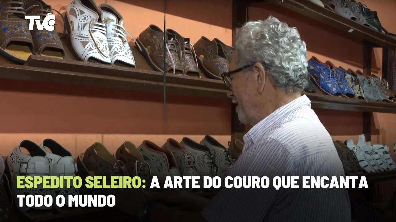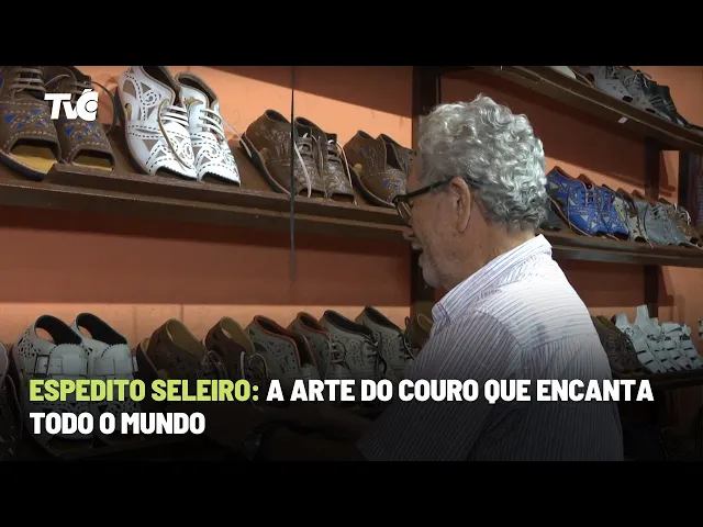 [Música] a genialidade de um mestre da cultura cearense está em cada detalhe de peças únicas [Música] este Expedito Veloso de Carvalho mas todos conhecem como Expedito celeiro nome que vem de família quase todos Vaqueiros ou celeiros ou seja artesãos que fazem celas de montaria foi observando o pai que o aprendiz pôde posteriormente se tornar mestre e como tal criou sua própria forma de fazer produtos com couro Artes inconfundíveis na época né aí o meu pai era Vaqueiro também aí ele chegava que ia trabalhar na oficina e eu do lado aí ele faz uma peça grande