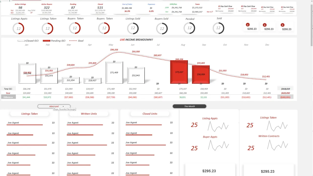 see exactly what your newest listings are all of your upcoming closings your recent closing so as a CEO you can just log right in here this converts to mobile as well so no matter where you're at you can just log into your dashboard and see this live real-time data and there's no logging into the onedrive account to do that you can just log right in to our website and see all of this data and what's really nice is the ability but the advanced is we can keep on adding more to our dashboard there's really going