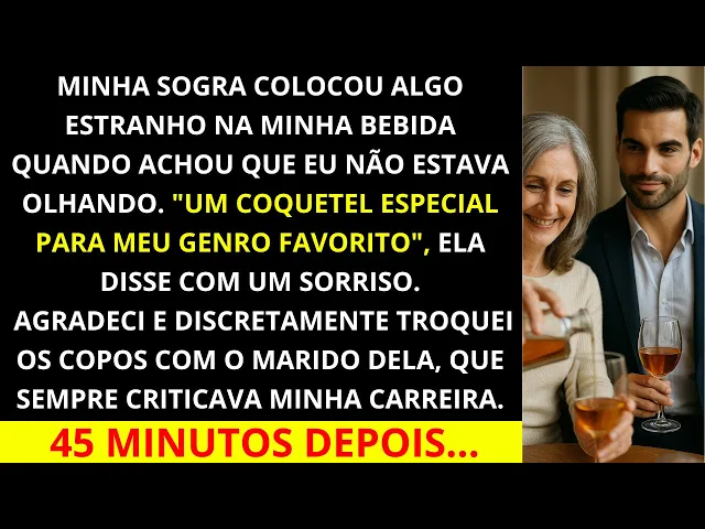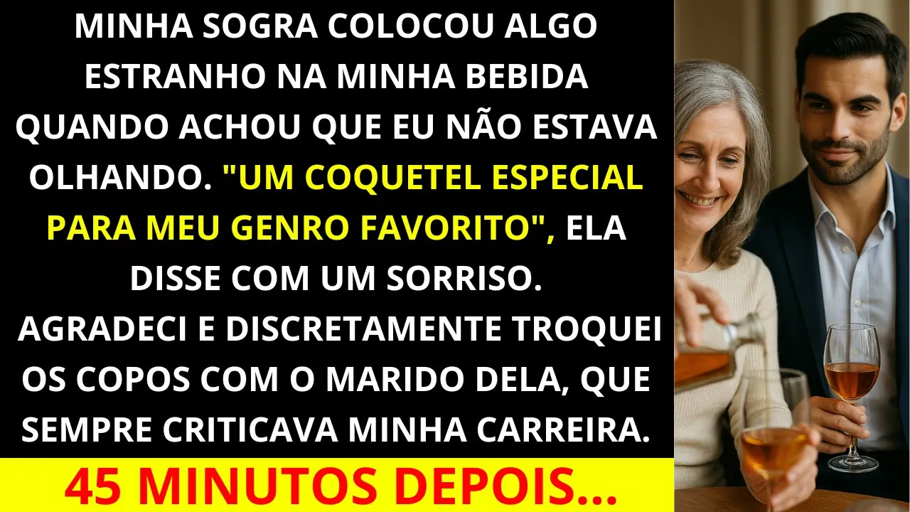 Minha sogra derramou algo estranho na minha bebida quando pensou que eu não estava olhando. "Um coquetel especial para meu genro favorito", ela disse com um sorriso. "Agradeci e discretamente troquei os copos com o marido dela, que sempre criticava minha carreira.