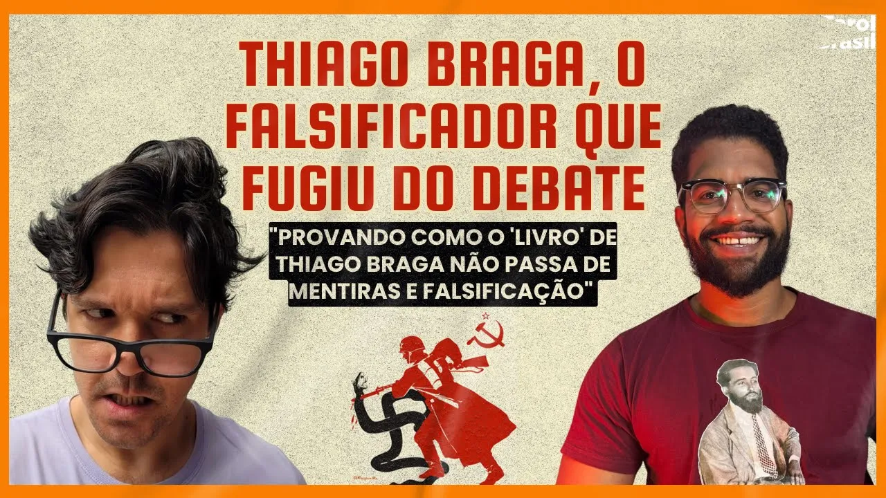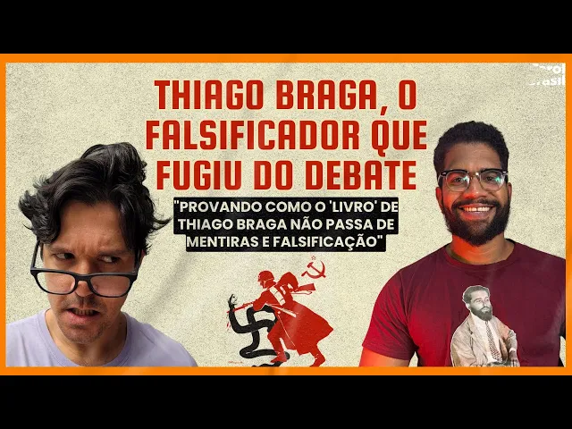 com o Thiago Braga, né? Mas o Thiago Braga, ele correu do debate. Ele correu do debate. E aí, que que a gente vai fazer aqui neste vídeo? Eu vou provar que o Thiago Braga fugiu ao debate e mentiu para a base dele e vou começar a expor o método de falsificação, Falsificação de citações, falsificação de cronologia histórica, omissão de fatos, enfim, como o Thiago Braga, ele não é um historiador, ele é alguém que falsifica abertamente o conteúdo que ele se propõe a abordar. A gente vai mostrar isso a partir de exemplos do livro dele e