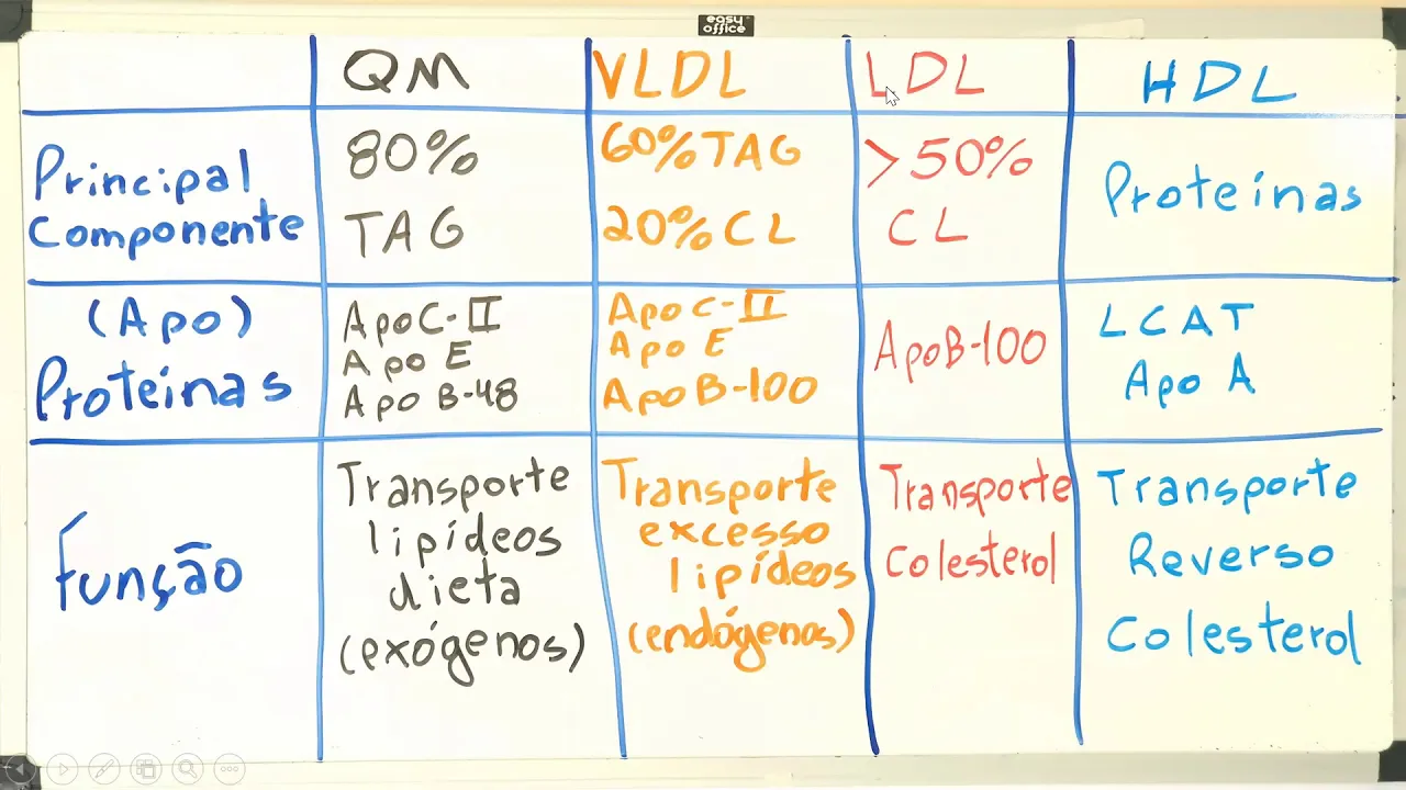 quilomicrons vldl eo ldl e do hd quilomícron quilomícron é uma lipoproteína formado oitenta por cento da lipoproteína é triacilglicerol então no teu amigo vem o que o que forma também eu posso lipídio colesterol livro com significado proteína e 35 céu só que desses quatro componentes oitenta por cento vão ser de triacilglicerol a zappos que tem no quilômetro daqui a pouco a gente vai falar função delas ele tem a para você dois a oea ea apob48 a função do quilômetros ele faz o transporte dos lipídeos da dieta a gente também pode falar dos lipídios episódio a