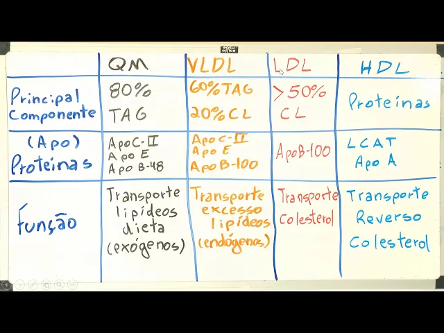dá a característica dessa lipoproteína com relação à composição além disso a gente vai falar da satos que contém cada pena que vão ter um papel importante tá e a gente vai falar nesse nessa primeira tabela da função geral dessas lipoproteínas depois de um esquema que eu fiz vai ficar mais fácil a gente enxergar isso acontecer a nós vamos lá o que deixou diminuir a câmera aqui para não ocupar espaço vocês estão aqui a gente tem aí a tabelinha que eu falei vejo principal componente né a zappos né que são as proteínas a função aí do