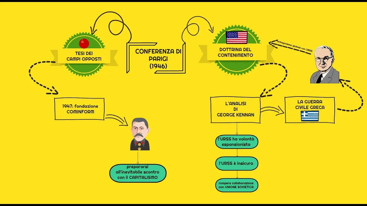 iii v vi ha dedicato alla storia della guerra fredda nel video precedente che potete recuperare dal link in sovraimpressione abbiamo visto come nel corso del 1946 le relazioni fra stati uniti e unione sovietica si abbiano rapidamente verso un punto di rottura adatto che si comincia a parlare di cortina di ferro l'ultimo vero accordo fra le due superpotenze è quello che si registra nella conferenza di parigi nel 1946 stesso in cui si arrivano a concludere alcuni accordi sulla sistemazione dei confini post bellici ma significativamente a parigi non viene raggiunto nessun accordo definitivo su l'assetto della futura