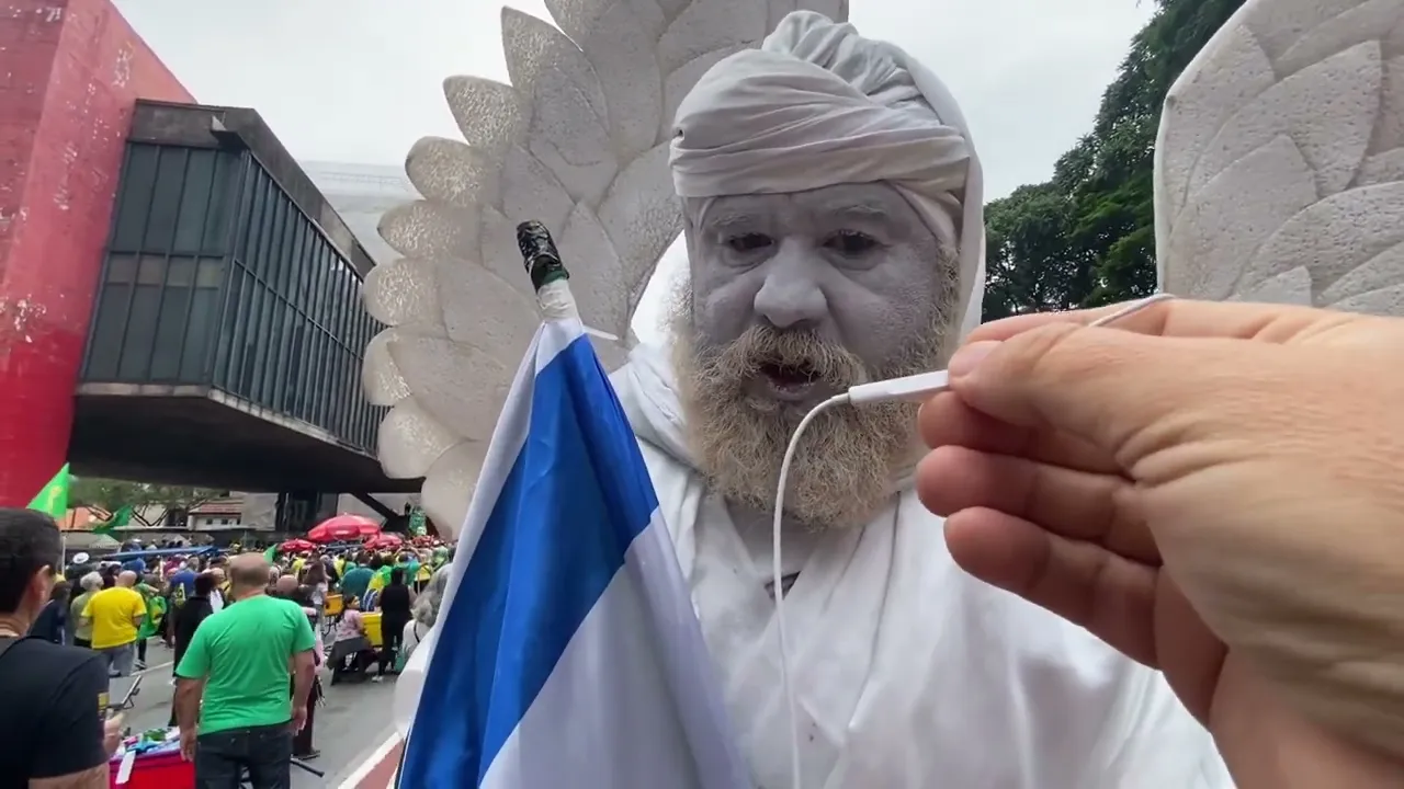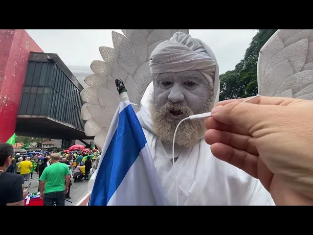 a gente tá aqui com o homem estátua você tá com uma bandeira de Israel e uma do Brasil por que que você tá fazendo isso aqui hoje eu estou vendo hoje que a pátria ela está errada na Constituição pois alguns ministros do STF por sua vez por decisões monocráticas estão achando que são dono do país não foram eleitos para nada não tem voto de ninguém cariro eiz quanto a bandeira de Israel Israel estava em paz e alguém foi lá e matou sua família Israel está se defendendo contra terroristas que não tem bandeira que não tem