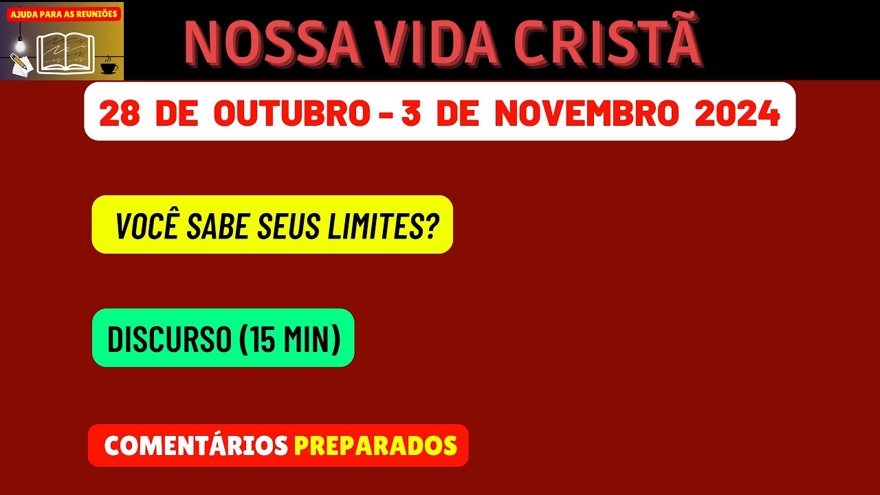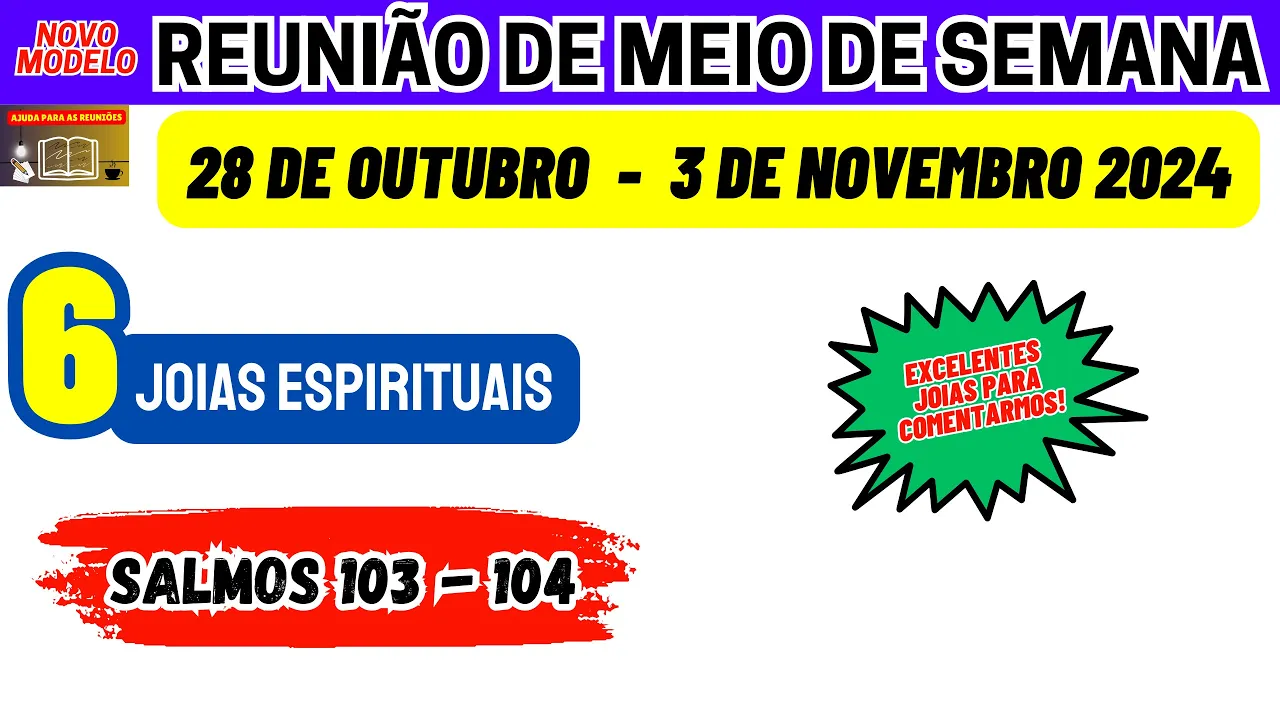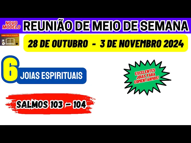 Olá meus amados irmãos sejam todos muito bem-vindos ao nosso canal ajuda para as reuniões Esperamos que todos vocês estejam bem e tenham tido um excelente fim de semana meus queridos na reunião desta semana 28 de outubro a 3 de novembro nós estaremos considerando a leitura dos Salmos 103 A 104 esse texto é a base de toda a reunião e neste vídeo como de costume de maneira objetiva analisar e preparar as joias espirituais que podemos encontrar nesse relato tão encorajador [Música] e para a primeira pergunta da apila temos como base o texto do Salmo 104 verso