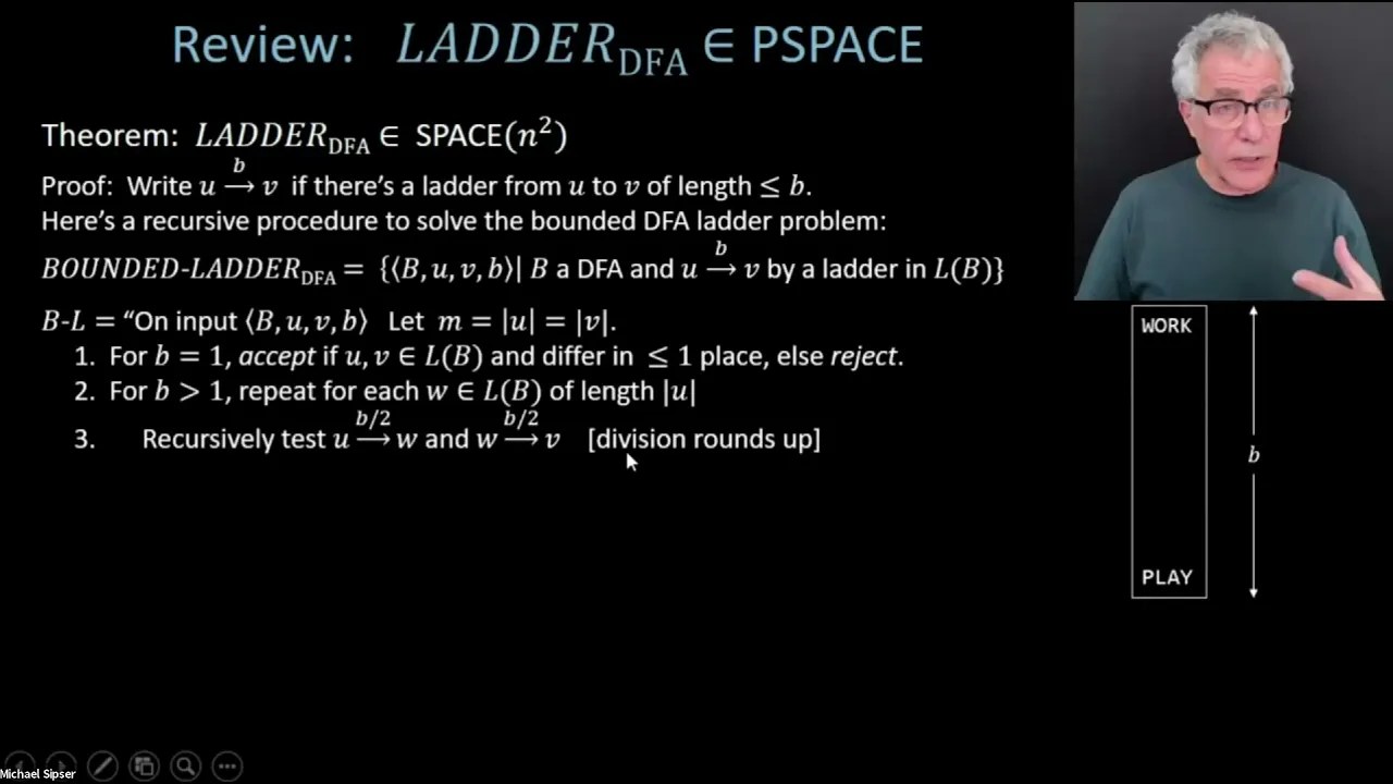 that every time um okay so here we go here is some candidate W string which is half halfway through um recursively test can I get from the starting string to that W and from W to that ending string um if I can if I find such a w then I accept and if I try all possible W and I Never man managed to find a way um to make both the top and the bottom work then I know I cannot get from D you know from the the starting string to the ending string within bsteps