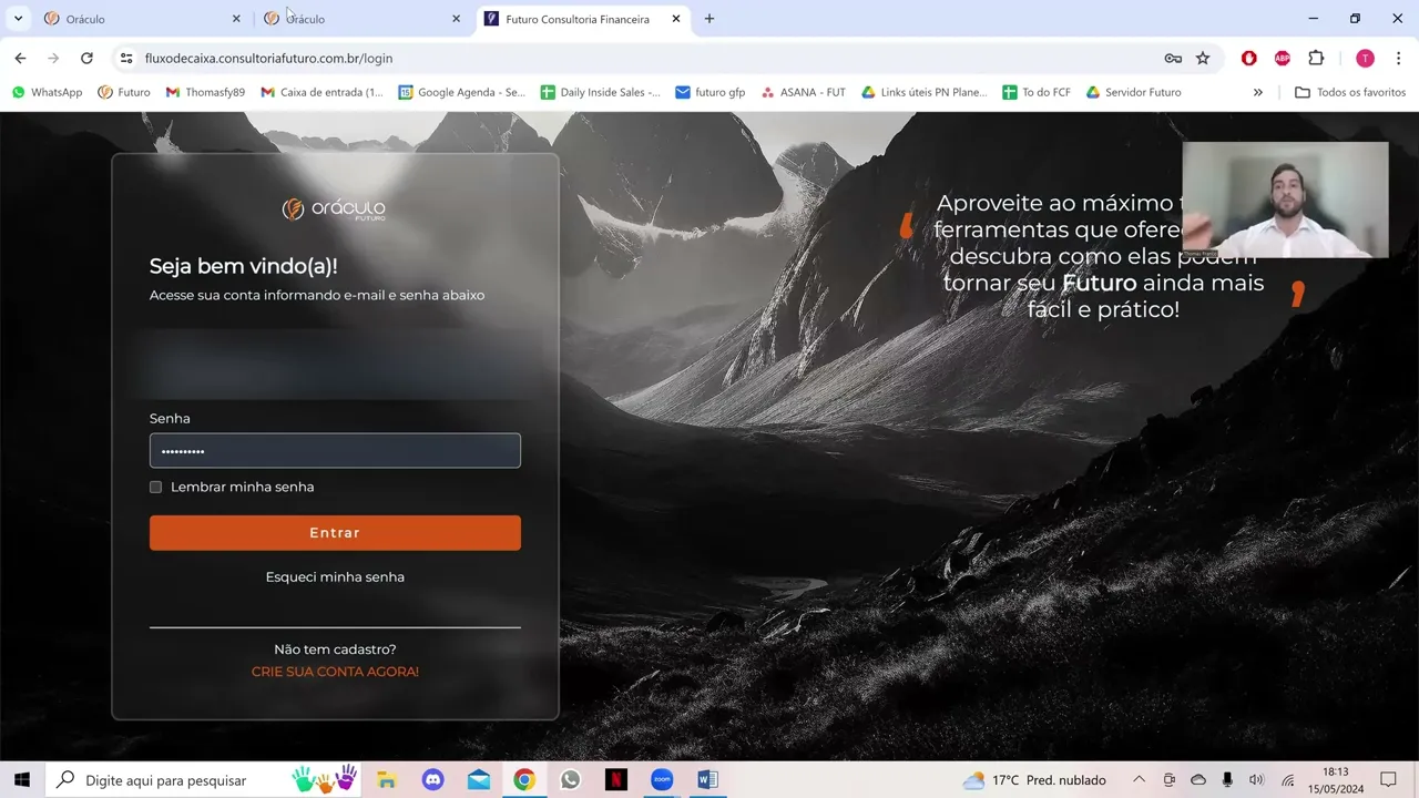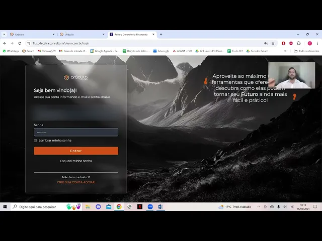a fazer esse primeiro acesso vamos lá então pra gente começar o primeiro acesso do cliente a gente vai mandar um link bem simples o link bem intuitivo o nome do link é fluxo caixa. consultoria futuro.com.br ao entrar no link o seu cliente vai chegar com nessa tela aqui essa tela seja bem-vindo então ele não tem acesso ainda primeiro acesso que ele tá fazendo então bem simples aqui ó não tem acesso então crie sua conta agora cliquei aqui eu como cliente vou fazer o registro vou colocar meu CPF importante ser o mesmo CPF que Bata com