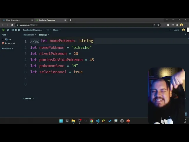 Primeira coisa eu ia precisar de uma variável para guardar o que o nome do Pokémon Então vamos lá vou colocar barrabá para fazer um comentário aqui tá então só para deixar um comentário e a primeira coisa que eu ia precisar é uma let né colocar aqui para declarar uma variável e vou dar um nome para essa variável que eu vou colocar nome Pokémon E aí eu vou atribuir um valor aqui tá eu posso atribuir um valor agora ou posso atribuir um valor depois tá Por enquanto eu só vou criar a minha variável eu preciso de