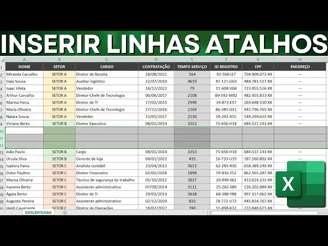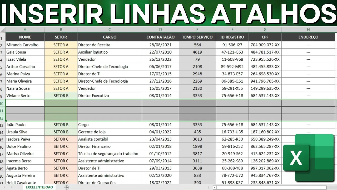 aqui numa planilha do Excel é o seguinte a gente pode simplesmente clicar aqui na linha 10 ou na linha 9 na linha que a gente quer adicionar então supondo que eu clico aqui na linha 10 porque eu quero justamente inserir uma linha aqui no meio representando o novo colaborador do Setor B já ensino a linha no lugar certo Clica com o botão direito do mouse clica aqui ó inserir simples assim e perceba que dessa forma já coloca uma nova linha para mim seguindo a formatação correta inclusive já pintou a célula na cor verde né tudo