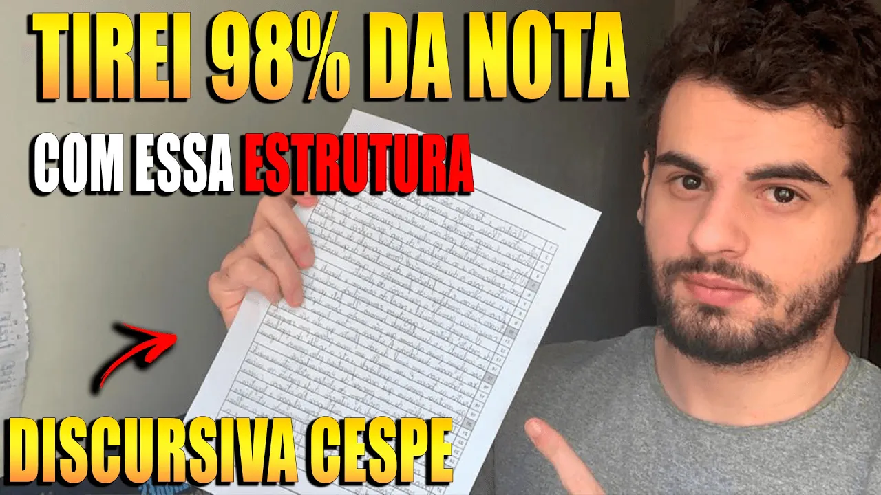no vídeo de hoje eu vou mostrar e analisar com vocês a estrutura EA discursiva na banca CESPE feito por mim que tirou 98 por cento da nota para que você possa seguir essa mesma estrutura e tem esse mesmo resultado ó E aí galera sou o Pedro Servidor Público Federal e agora eu trouxe mais uma análise de discursiva do SESC que tirar nota máxima dessa vez eu eu trouxe aqui antes com seu é feita por mim mesmo uma das vezes discursivas que tiraram a nota máxima essa discursiva vale a 40 pontos e eu tirei 39. 67. 5 o que dá mais ou menos aí 98 99 porcento da nota e eu tenho certeza que você seja uma estrutura começa aqui eu vou te ensinar a você consegue ter um mesmo resultado uma prova discursiva do CESPE porque como eu sempre viu falando aqui com vocês galera discursiva tem sido cada vez mais cobrada ela tem sido cada vez mais relevância na pontuação na nota concurso de nível médio nível superior hoje até em cobrado discursiva que eu acho muito importante também porque é necessário que sempre dos saiba redige bem na uma grande maioria dos casos e aquela história muita gente manda muito bem na prova objetiva E negligência a prova discursiva e perde muitas posições muitas vezes Deixa de ser aprovado no concurso público porque não mandou bem na discursiva e é por isso que eu trouxe uma análise aqui e para você que tem uma prova discursiva que tirou nota máxima para que você aplique o que tá nela e consiga ter resultados semelhantes aí então vou mostrar para vocês aqui uma prova discursiva do SESC nota máxima feita por mim não esquece de deixar o seu like se inscrever no canal e ativar o Sininho para você poder receber os próximos vídeos próximos análises e muito conteúdo que vai vir por aí tá bom então vamos agora para a tela do meu computador para eu te mostrar essa redação e a gente fazer essa análise então aqui galera esse aqui era o tema da discursiva Tá bom então que era um tema é sobre plástico aqui tem um texto motivador aqui falando sobre o plástico e tem aqueles três famosos três tópicos que o CESPE cobra então primeiro tópico aqui o plástico como uma tecnologia em benefício da vida moderna valendo 12 pontos o impacto ambiental e social do consumo e descarte indevido de produtos plásticos 12 pontos a alternativa a reciclagem do plástico para reduzir a presença desse produto no lixo 14 pontos então nós temos aqui três tópicos muito famosos pelo CESPE D2 e para cá todas as redações as discursivas que vocês têm cobrando assim de textos argumentativos e expositivos ele coloca um texto maior né um título maior nesse aqui não veio mais um texto no título maior e três tópicos desse mesmo jeito aqui então tem que se preparar mais ou menos para isso aqui também porque a tendência é que o Sesc continue cobrando três tópicos aqui para você de bater cada um com a pontuação E aí você vai deixar bem claro sobre qual top que você tá falando em cada parágrafo Tá bom então esse aqui era o tema basicamente o plástico Como a tecnologia e os impactos sociais enfim do plástico o plástico ao tema central aqui a primeira ponto que você ficar atento é quais são as palavras-chave tem que ficar muito ligado as palavras-chave que o texto tá te pedindo então aqui ó plástico tecnologia nessa benefício da vida moderna Impacto Social e Ambiental do consumo tem que estar muito ligado tem que circular as palavras chaves da sua redação a sua discursiva aí para você utilizar mas o seu texto processo de valoriza muito isso que utilizar as palavras-chave do texto é muito bem claro sobre o que que ele tá falando a discussão do SESC que aquela que você tem que responder o que está sendo perguntado tem Muita enrolação sem muita firula Então tá falando para falar do plástico a gente vai falar do plástico Tá bom então aqui ó essa aqui é a redação eu coloquei três parágrafos nessa época que eu fiz três parágrafos tá bom E mesmo assim tirei a nota máxima o que que eu faria de diferente hoje hoje eu colocaria uma introdução que pelo menos quatro a cinco linhas eu colocar em introdução de patas sombrinha pequena só falando sobre o tema central do texto peso Por que que hoje você colocaria isso porque nas folhas de respostas hoje do CESPE ele fala que as redações devem ter introdução Tá bom então a pessoa que deixa de fazer introdução hoje pode acabar perdendo a Nossa então você ficar ligado nisso que hoje é eu faria também uma introdução aqui de quatro a cinco linhas pequena porém No resto seguir ia muito parecido com isso aqui tá bom eu faria um parágrafo para cada tópico e deixando bem claro eu fiz essas palavras-chaves todo o resto você pode fazer do mesmo jeito o que você vai garantir uma nota máxima para você e argumentação tudo que eu vou falar aqui continua valendo cem porcento a única diferença é a introdução que eu recomendo que você faça introdução de quatro a cinco linhas aí hoje tá bom antes de começar mais alta esqueci galera vamos perceber que o aspectos de estrutura primeiro Olha nem mesmo texto não tem rasuras quando eu errei uma palavra eu coloquei só um tracinho aqui e continuei aqui depois eu não coloquei nenhum de ferradura aqui em praticamente todas as minhas eu fui até o finalzinho da linha não deixa espaço sobrando aqui na linha Tá vendo só tem aqui um pouquinho que tem um ponto final aqui tá vendo Então aproveitei o máximo eu acho que usei até a última linha do texto isso é muito importante porque o conteúdo o que vale no Sesc o mais importante de tudo é o conteúdo 7 dar uma nota muito alta para conteúdo então é você tem que aproveitar todas as minhas possível de seu texto aqui eu coloquei parágrafos olhos passadinhas tá vendo com uma margem vim aqui eu fiz uma letra legível você quiser que eu te dá uma letra que você dá para ler não é uma letra bonita nem de longe uma letra bonita mas é uma letra