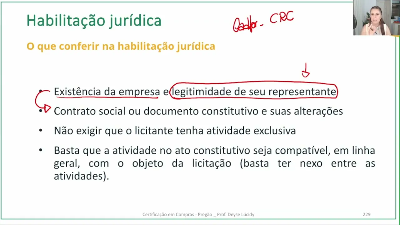 da atividade a ser contratada quando cabível né se não precisar de ter autorização não precisa de ter aqui então vamos lá o que que eu vou analisar na habilitação jurídica que que eu falo para vocês conferirem sempre primeiramente vê lá no edital vê o que que tá sendo exigido na relação lá do for do CRC tem uma separação por tipo de empresa Qual que é a documentação de habilitação jurídica necessária Mas o que eu quero que vocês foquem é nesses pontos aqui primeiro ponto você vai verificar checar a existência da empresa e essa existência da