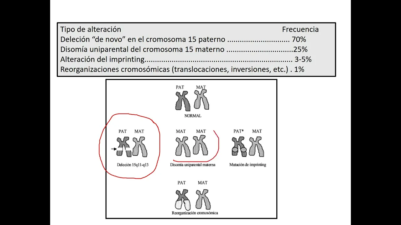 ángelman ahora una cosa interesante es que se ha visto últimamente que muchas neoplasias O sea la generación de células tumorales se debe a una pérdida en la impronta O sea se debe a una hipometilación de genes sobre todo de los oncogenes aquellos que se están mutados este pueden producir células tumorales vamos a ver entonces nuestro primer caso clínico que se llama prader win veamos primero la etiología genética de la patología de praderwin Existen varios casos vamos a analizar los cuatro que están en pantalla vamos a dejar Primero este la dirección de novo este que será