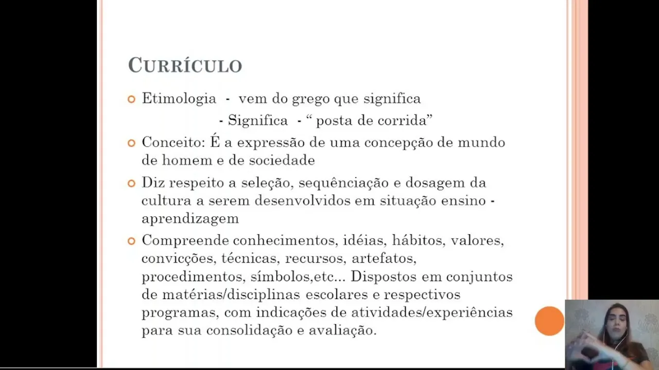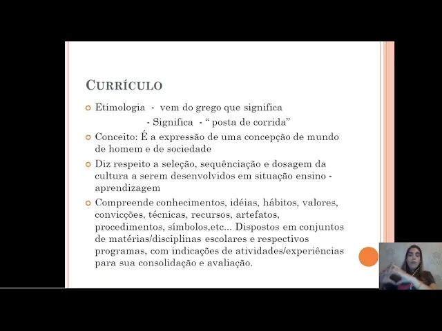 estão aqui que você pensou diferente eu espero que esse seja o meu desafio da aula de hoje tratar Estes conteúdos que vocês mencionaram aí nos registros de vocês ao longo da aula tá bom esse é o desafio da professora Aline espero que vocês então com essa atividade prática de sensibilização ao conteúdo já partindo da ideia de que você já tem conhecimento prévio sobre o assunto sejam bem-vindos ao conteúdo de hoje é muito bem currículo currículo a etimologia da palavra vem do grego que significa Posta de corrida Qual que é o conceito sobre currículo currículo é