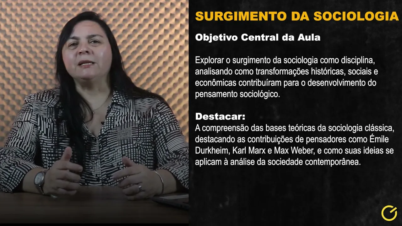 Qual é o objetivo central da nossa aula? É explorar o surgimento da sociologia como disciplina, analisando como transformações históricas, sociais e econômicas contribuíram para a construção do pensamento sociológico. Esta aula busca proporcionar uma compreensão das bases teóricas da sociologia clássica, destacando as contribuições de pensadores como Émile Durkheim, Karl Marx e Max Weber, e como suas ideias se aplicam à análise da sociedade contemporânea.