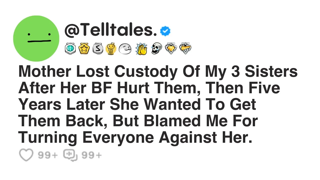 Mother lost custody of my three sisters after her BF hurt them. Then 5 years later she wanted to get them back but blamed me for turning everyone against her. Hello all.