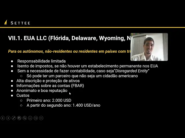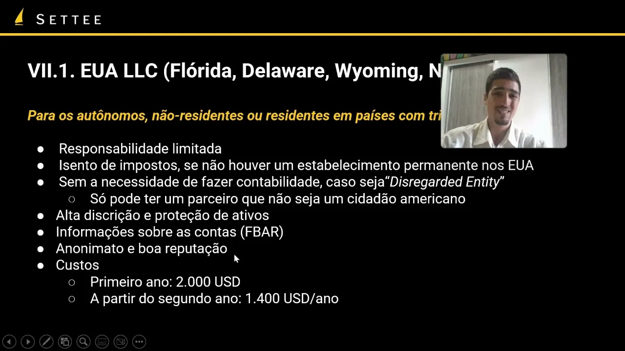ele você faz sentido para quem quer fazer investimentos que é uma empresa para fazer trading para uma Hold basicamente se você já se encaixa no que a gente falou aqui de nômade ou residente em país de tributação territorial você não vai ter nenhuma vantagem fiscal em relação a isso você já estaria isento de impostos americana pode fazer sentido para você ter acesso talvez a corretoras Americanas que você não conseguiria Abrir de outra forma mas assim vai ter vantagem na responsabilidade limitada mas fora isso é nível de imposto não vai ter muita vantagem Porque como mencionado