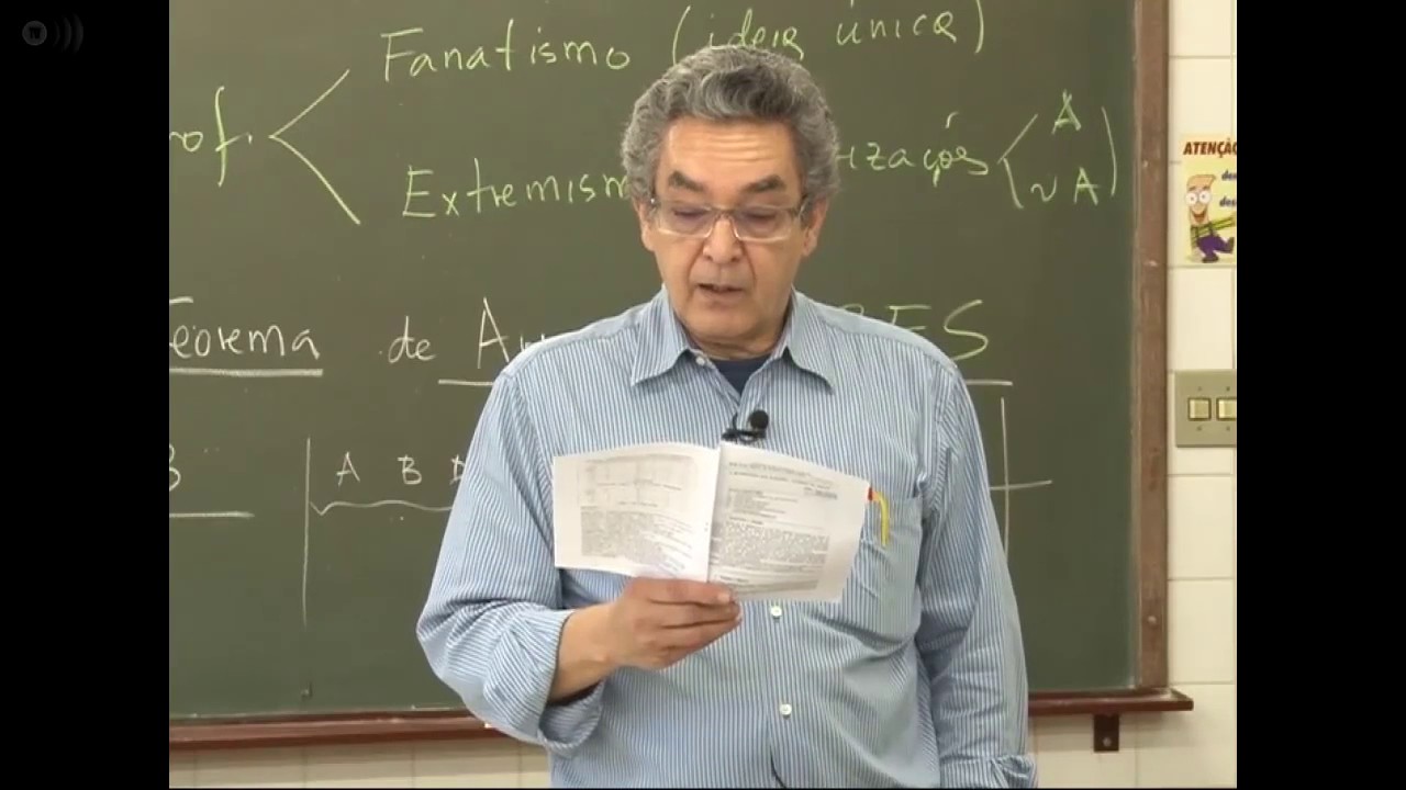 guerras de um modo geral todas essas guerras assim que são atualizações de de projetos assim projetos a realização de projetos então eu diria assim tem uma idéia só é uma das desgraças uma dá uma ideia só esse é o fanatismo e se resume a há ou não há é o extremismo e se resume a duas assim dizendo outro desse lado outro daqueles e quem não está comigo é meu inimigo o professor se fosse reduzir a função do professor ao mínimo mínima é é a adoção mais nítida a função do professor é interessante porque não é