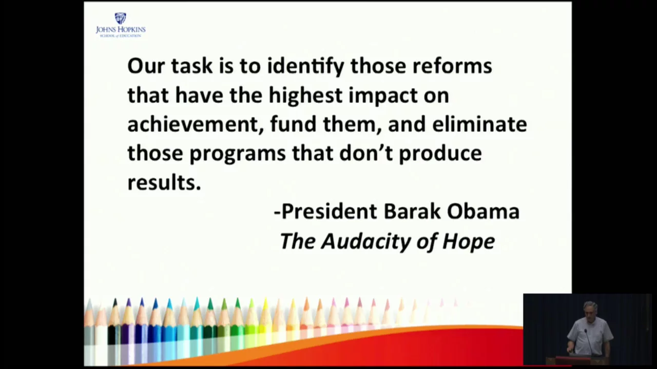 eliminate programs that do not produce results that's pretty radical if you said it about medicine of course it wouldn't be radical in the slightest but if but to say it about education in particular is a radical statement and he followed through on that idea and not only in education but or not in other fields as well that are going through a similar transition had where they didn't use to have evidence involved and now they do so what's the concept here school reform ordinarily is it is a story of churn of ideas coming and going of