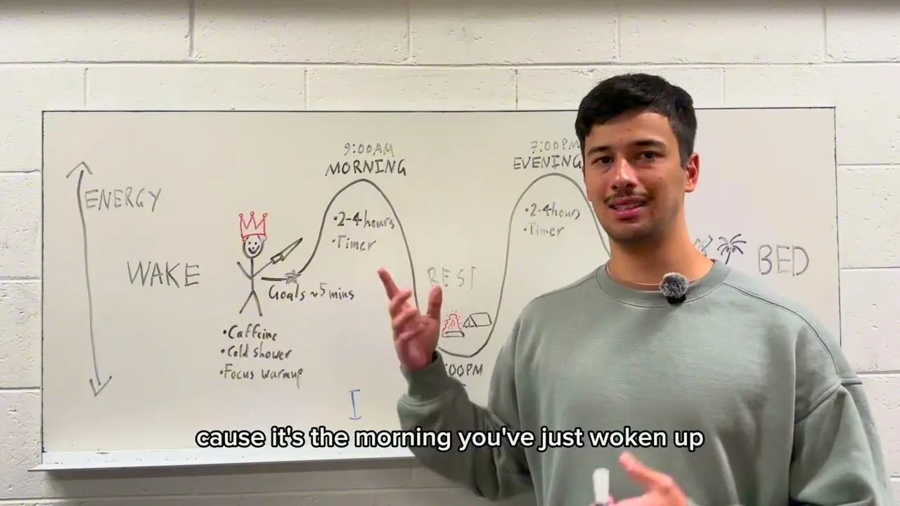 all right kids welcome back to the classroom so in this video I'm going to explain my four-part daily routine that I used during engineering school to help me get straight A in my exams because this routine that I'm going to explain behind me it seems complicated but trust me it's very simple very intuitive it takes advantage of some basic human biology and psychology to optimize your day for the highest grades with the least amount of stress and I can say this because I literally looked forward to exam season because of this routine partly because of this routine partly because I learned to love studying which go watch my videos about it if you're interested but I'm going to go through this routine right now and trust me I think you're going to love it it's super effective it's very very easy to follow and hopefully it's going to be fun here as well classes in session I know it looks complicated but trust me it's very simple this is one day this is one day here's where you wake up on the left and time goes on throughout the day and here's where you go to bed at night time on the right okay so why is it this weird ass shape why is it like up and down well it's very simple this is you you start off in the morning in the day and basically your body has something called a Cadian Rhythm where basically throughout the day your energy fluctuates up and down you might notice this at sometimes parts of the day you're more tired than other parts of the day so this up and down is actually your energy so let me explain you wake up in the morning this is you and in the morning your energy is at a peak I've put arbitrary times here by the way this is just me my Cadian Rhythm might not be exactly yours but at 9:00 a. m. my energy is at a peak my circadian rhythm is at a peak and as the afternoon goes along my energy drops till about 3 p.