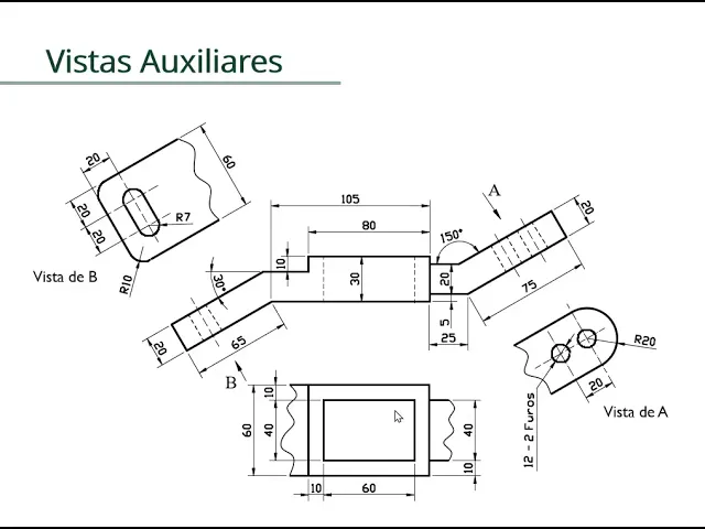 não envia representar dele então eu posso representar a vista auxiliar B da vista auxiliar a viagem posso apresentar daqui para lá e daqui para cá tem nós duas vistas auxiliares Isso facilita a nossa projeção a nossa a cotagem de forma ortogonal os detalhes que Ah tá então ficar essa possibilidade então duplas uma a partir da outra né abelha partir da vista auxiliará eu posso ter também mais do que um anjo está auxiliar vem aqui ó eu tenho uma vista frontal e tem uma base reta um ângulo para cá e um ângulo para cá certo então