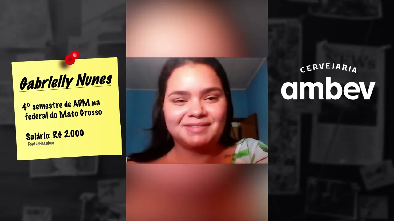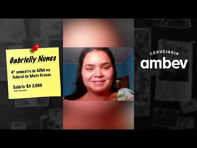 work Shop e cara sabe quando você tem um choque a sua cabeça explode Assim você fica tipo a minha cabeça literalmente explodiu naquele momento que eu fui começando a perceber bom eu posso entrar numa empresa maior e eu posso ser efetivada eu posso ter uma carreira aqui e outra coisa eu posso tipo gostar disso eu posso tipo me ver ali e nisso Ambev tava com um processo seletivo aberto e aí eu me escrevi só aqui sabe como você se escreve só por escrever tipo ah à toa e fui lá assistir workshop eu falei calma aí