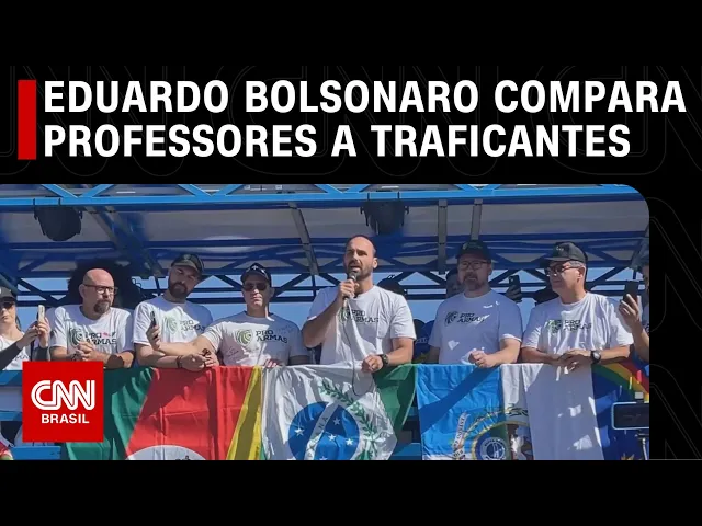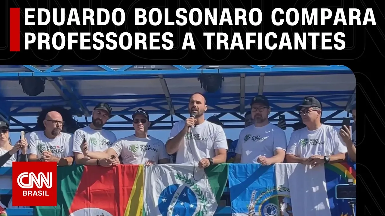durante o encontro nacional pro armas em Brasília o deputado federal Eduardo bolsonaro comparou Professor doutrinador a traficantes a gente tem esse trecho vamos ver e o certo começa pela nossa família se nós por exemplo estivermos uma geração em que os pais preste atenção na educação dos filhos tirem um tempo para ver o que que eles estão aprendendo nas escolas não vai ter espaço para professor doutrinador tentar sequestrar as nossas crianças não tem diferença não tem diferença de um professor doutrinador para um traficante de drogas que tenta sequestrar e levar os nossos filhos para o mundo