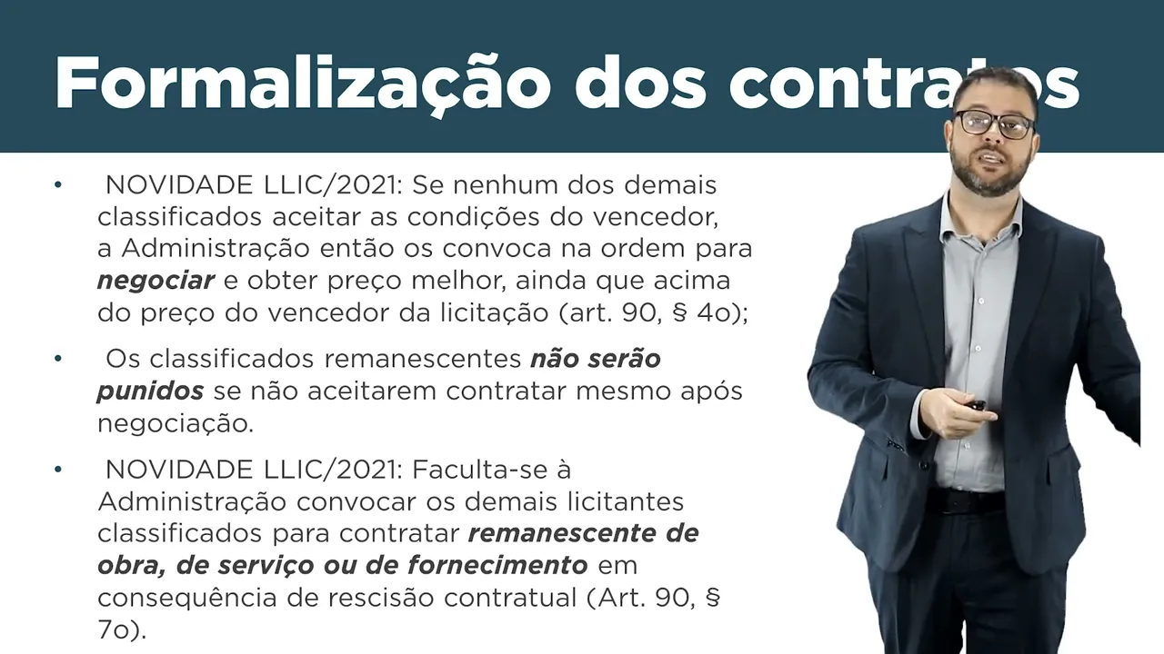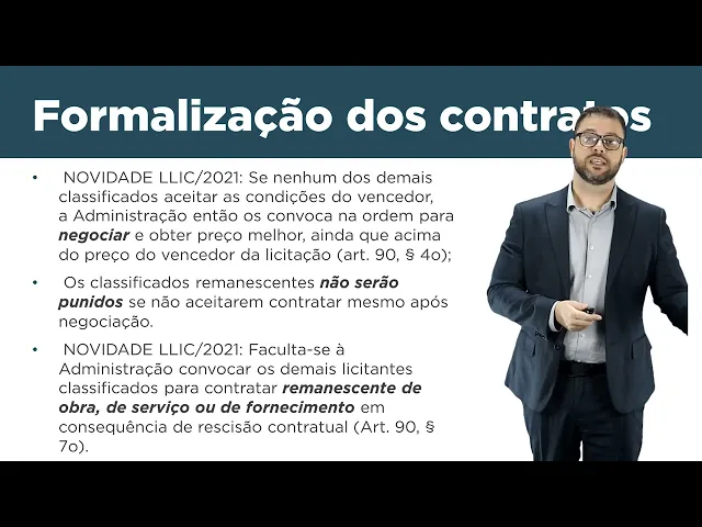 problema que ocasiona a rescisão os licitantes remanescentes sejam chamados e sejam contratados para concluir aquele contrato Então essa solução muito interessante porque porque vida que a administração tem que fazer uma nova licitação por conta de um contrato descumprido durante o seu corpo eu gostaria também de apontar algumas considerações sobre o atual esse capítulo da Lei de licitações que trata de formalização dos contratos também fala de interpretação EA um artigo muito importante sobre essa temática que o artigo 89 nós temos que ter em mente quando falamos de interpretação contratual que a relação contratual no Direito Administrativo