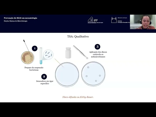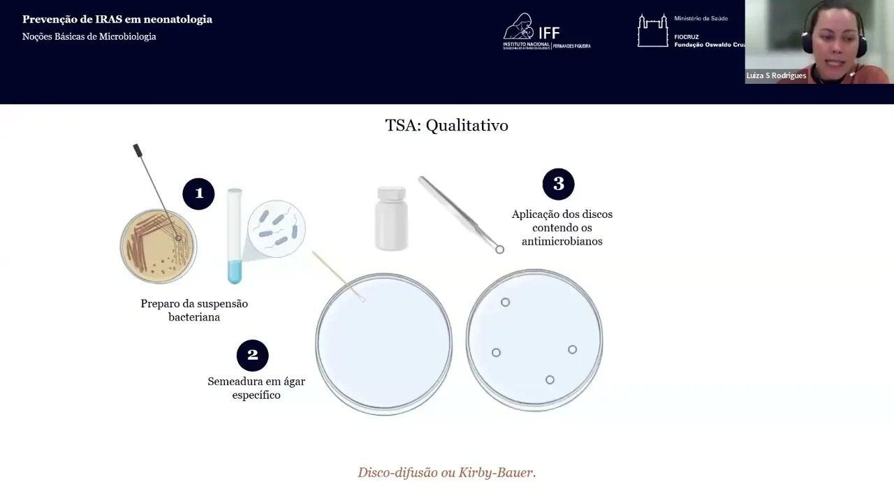 Olá meu nome é Luísa eu sou biomédica microbiologista mestre em ciências pelo Hospital das Clínicas da Faculdade de Medicina da Universidade de São Paulo Doutora em biotecnologia aplicada à saúde da Criança e do Adolescente pelas faculdades pequen ppe e atualmente assistente de pesquisa no Instituto de Pesquisa pela pequeno prícipe então dentro do módulo noções básicas de microbiologia eu fui convidada a fazer uma breve apresentação sobre a avaliação do perfil de sensibilidade aos antimicrobianos também conhecido como antibiograma bom então aqui eu vou fazer uma breve introdução sobre o teste de sensibilidade aos antimicrobianos vou falar um