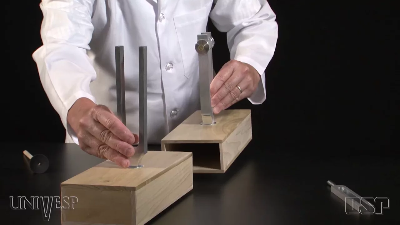 [Música] para esta demonstração usaremos dois diapasões acoplados em caixas de ressonância um diapão menor um martelinho cabeça de borracha e um pêndulo de isopor pendurado com fio fino de nylon iniciaremos com um experimento de ressonância usaremos dois diapasões montados numa caixa de madeira sendo que um deles tem dois pezinhos presos nas extremidades que podem ser ajustados assim ao bater o martelinho na ase do diapasão ela irá vibrar e transmitir essa vibração para a caixa de madeira a caixa por sua vez fará o ar dentro dela vibrar na mesma frequência amplificando som se posicionarmos as caixas