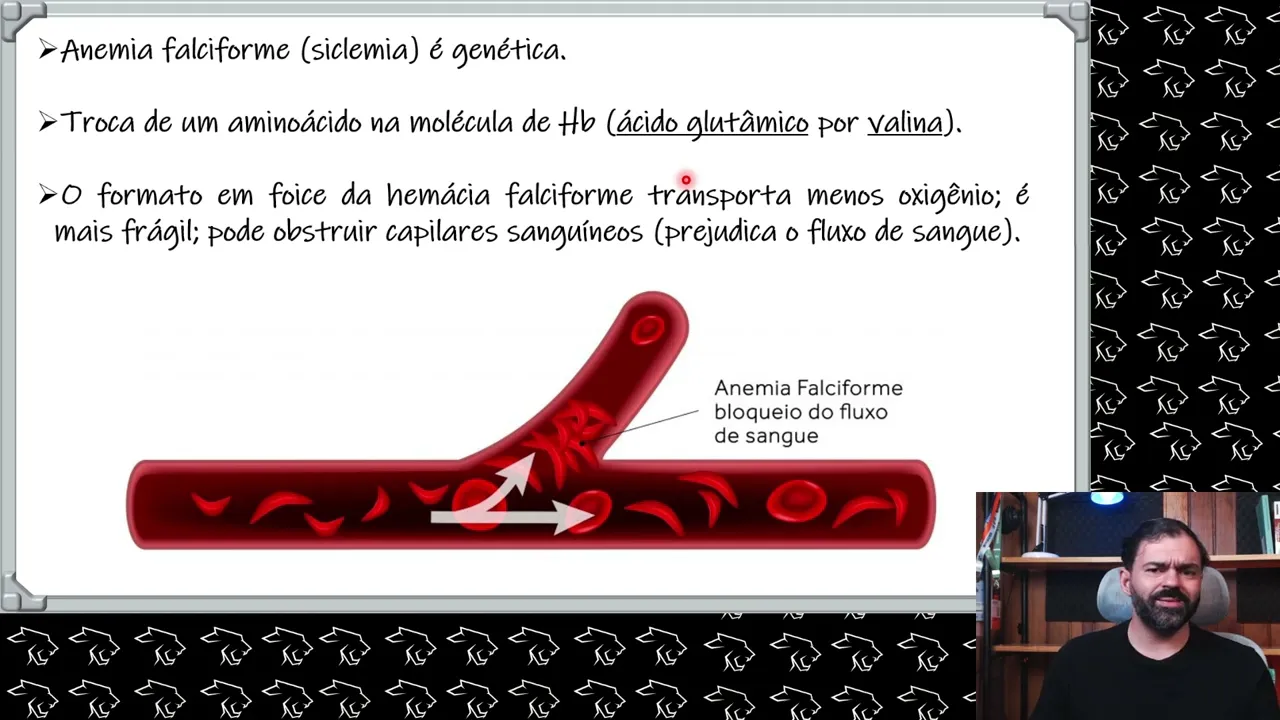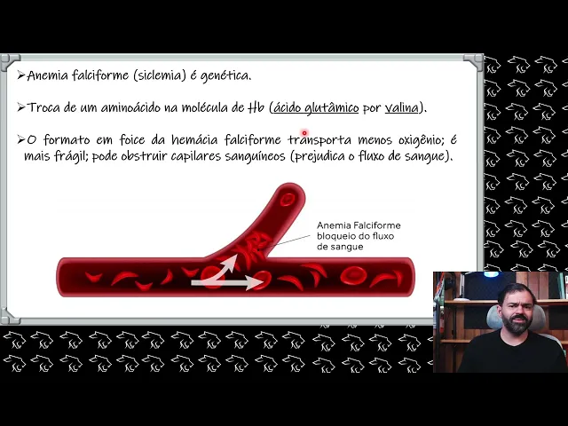 proteína responsável aí pelo transporte de oxigênio no sangue beleza a hemácia normal e a hemácia falsiforme aí em forma de foice isso acontece graças a uma única troca de um aminoácido beleza e aí pessoal algo que já caiu em vestibular é o seguinte o formato em foice da hemácia do indivíduo que tem a anemia falsiforme transporta menos oxigênio é mais frágil e pode obstruir capilares sanguíneos e essa obstrução vai prejudicar o fluxo de sangue tá E por que que pode causar essa obstrução com uma maior facilidade por conta do formato da célula falsiforme esse formato