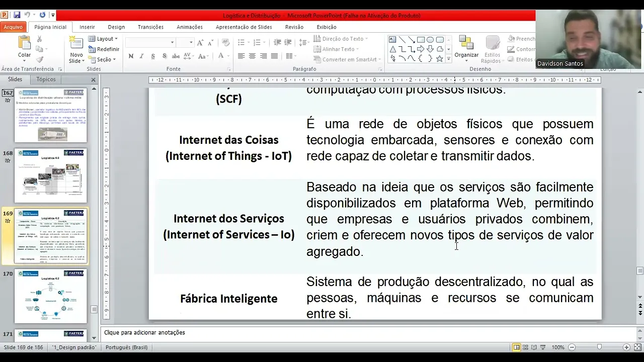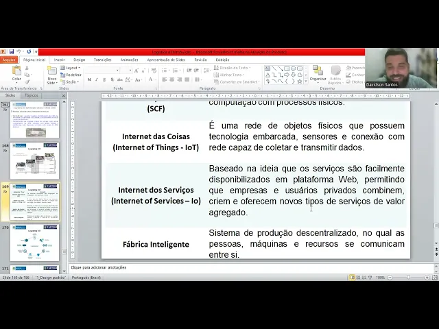 0 então sistemas Cyber físicos internet das coisas internet de serviço sistemas Cyber físicos eu integro e consigo monitorar tudo que acontece no físico eu consigo monitorar com sistemas consigo integrar o que acontece no físico na movimentação de fato na prática dentro de um armazém eu consigo integrar essa ter essa essas informações controlar esse processo D movimentação dessa mercadoria no interior do um armazém através de sistemas por isso que são sistemas Cyber físicos integrações de computação com processo físico eu integro o sistema com o que está ocorrendo dentro do Armazém com a movimentação de mercadorias de materiais que acontece dentro do Armazém internet das coisas é um mundo completamente conectado é a utilização de tecnologia embarcada então eu consigo hoje monitorar uma carga através de um chip por exemplo eu consigo monitorar a trajetória dessa carga e até algumas características importantes como a temperatura dessa carga eu consigo monitorar também então é um mundo completamente conectado é a internet das coisas eu tenho Outras aplicações por exemplo eu consigo controlar eh eletrodomésticos na minha casa né ter esse nível de integração um dispositivo móvel com tudo que tá acontecendo dentro da minha residência controlar eventual eventualmente ligar um eletrodoméstico ligar o ar condicionado por exemplo eu consigo ter esse nível de integração entre elementos entre o dispositivo móvel e o meu ar condicionado ou qualquer outros el eletrodomésticos [Música] dentro da minha residência a voz não tá das melhores tá então desculpem aí eh internet de serviços que são essas plataformas de serviço basiado na ideia que os serviços são facilmente disponibilizados em plataformas web permitindo que empresas e usuários combinem e criem e ofereçam novos tipos de serviço de valor então tem essa integração entre um transportador a contratada um prestador de serviço de transporte é contratante eu posso ter esse nível de integração em uma plataforma web e eu tenho perdão aqui aqui fábricas inteligentes que é uma fábrica onde o sistema de produção ele é completamente descentralizado e as pessoas e recursos conseguem se comunicar entre si eu tenho um nível de modernização e de autonomia Por parte dos sistemas que nunca antes foi visto chegando nesse estágio da indústria 4. aqui eu tenho os principais elementos robô autônomo Eu já falei que a Amazon utiliza robô autônomo no interior do seu Armazém você Central distribuição para movimentação de mercadorias eu tenho Big Data grandes bancos de dados agora existe uma relação do Big Data com a questão da cybersegurança garantir a integridade segurança desses dados que são movimentados por exemplo tem vários dados que são movimentados numa compra online então eu vou garantir integridade e a segurança desses dados a realidade aumentada eu eu consigo e pensar num Armazém utilizando sistemas consigo ter essa noção de como que deve ser esse armazém e a movimentação dentro desse Armazém eu consigo visualizar essa movimentação através de um óculos através de realidade aumentada até para utilizar para ensino para você ver na prática como que ocorre a movimentação no interior de um armazém manufatura aditiva muito utilizada para você na medicina tem aplicações na medicina e também muito utilizado para você ter o produto em menor escala como que é esse produto design tamanho formato Eli Você já consegue implementar alguns ajustes e consegue ter um produto que vai ser aderente e Vai facilitar a parte logística de armazenagem a gestão de estoque desse produto a parte de movimentação desse produto então eu consigo adaptar efetuar algumas melhorias do des des no formato desse produto isso vai auxiliar na parte logística computação em nuvem eu não preciso ter mais grandes servidores então eu consigo ter troca de dados entre uma transportadora um prestador de serviço Logístico uma contratada e um contratante eu consigo ter essa troca de dados entre essas partes isso é possível de acontecer tá então eh essa é uma outra uma outra questão não preciso dos grandes bancos de D servidores né eu consigo fazer isso com por meio de computação em nuvem a internet das coisas que a gente já falou a necessidade de integração entre os sistemas pensem em redes de suprimento várias empresas envolvidas para disponibilizar esse produto até o consumidor final então é necessário a integração entre diversos sistemas dessas empresas para esse produto cheguem perfeito estado na mão do consumidor final e a parte de simulação né eu posso trabalhar com simulação em relação a transporte simulações em relação a um novo layout uma nova organização interna de um armazém eu posso pensar em simulações em estudos logísticos de viabilidade Qual o modal que eu devo usar eh qual eh se eu tenho uma rede por exemplo de suprimentos eu tenho vários depósitos avaliar a possibilidade de fechar um depósito de descontinuar um depósito operar com menos depósitos com menos estruturas de armazenagem na minha rede suprimentos então tenho várias oportunidades de simulação né aquela aquela questão né primeiro você vê na teoria no teste faz os estudos e depois você você implementa então isso é o papel Esse é o papel da simulação tá pessoal fechamos aqui que eh logística 4.