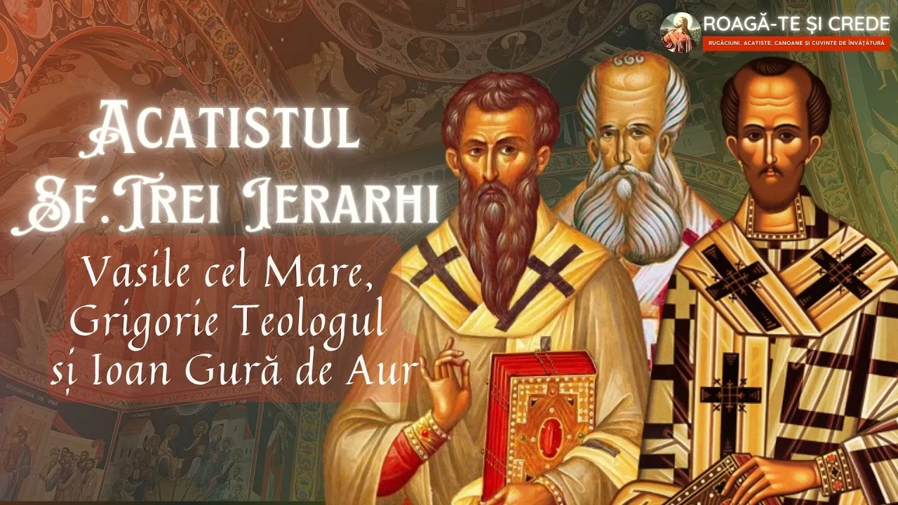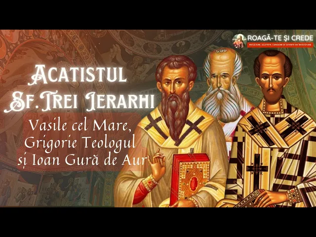 minte de Sfânta Treime Bucurați vă că ați covârșit Firea omenească cu darurile cele multe Bucurați vă stâlpi neclintiți ai bisericii Bucurați vă credincioase slugi ale Sfintei Bucurați vă mărgăritare strălucite ale bisericii lui Hristos Bucurați vă cei mai destoinici luminători ai pământenilor Bucurați vă Apărătorii dreptei credințe în Hristos Bucurați vă surpătură torii adevăratelor învățături Bucurați vă cârmuitorii bisericii și pomii luminați roditori ai fructelor celor mai alese Bucurați vă treime de arhierei mult lăudată pe acești trei mari ierarhi ai bisericii lui Dumnezeu cel slăvit în Sfânta Treime se cuvine să i cinstim ca pe unii ce au