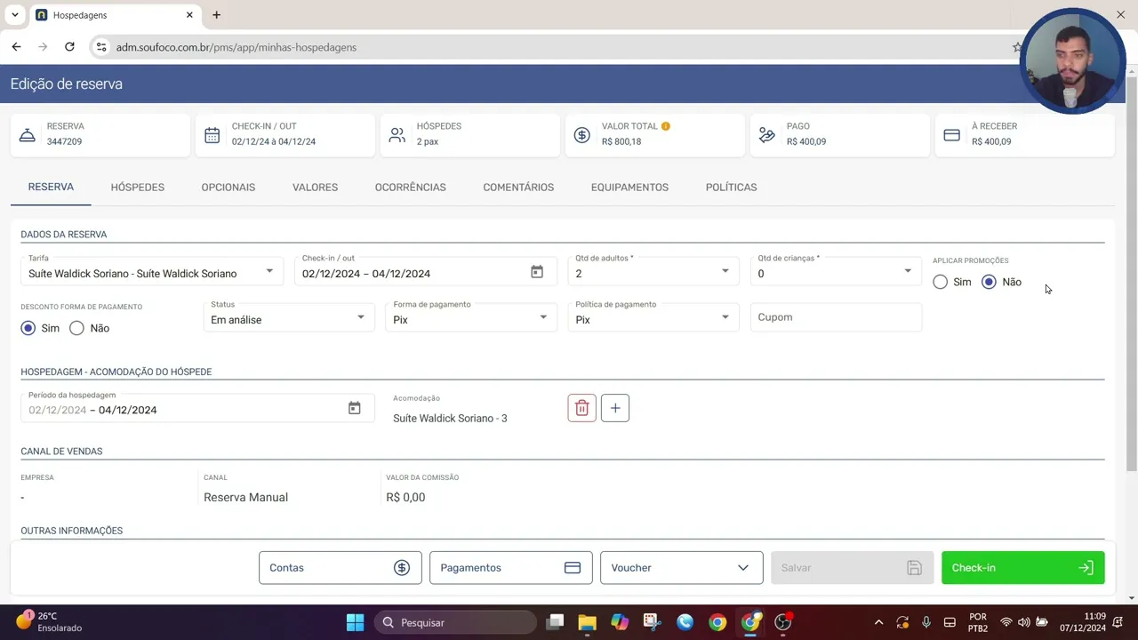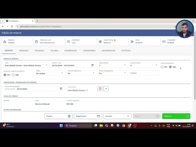 reserva como o número dela o nome e-mail CPF do hosped e assim do responsável pela compra né e assim por diante aqui também eu conseguiria buscar pelo status de pagamento logo do lado também eu conseguiria buscar pelo tipo de filtro se é referente ao checkin ou checkout e o período também escolhendo a data de início e a data final dessa busca ao filtrar tem aqui a lista e referente às hospedagens com dados de cada hóspede aqui eu consigo identificar o ID da reserva né o código da reserva checkin checkout o hóspede a categoria de acomodação