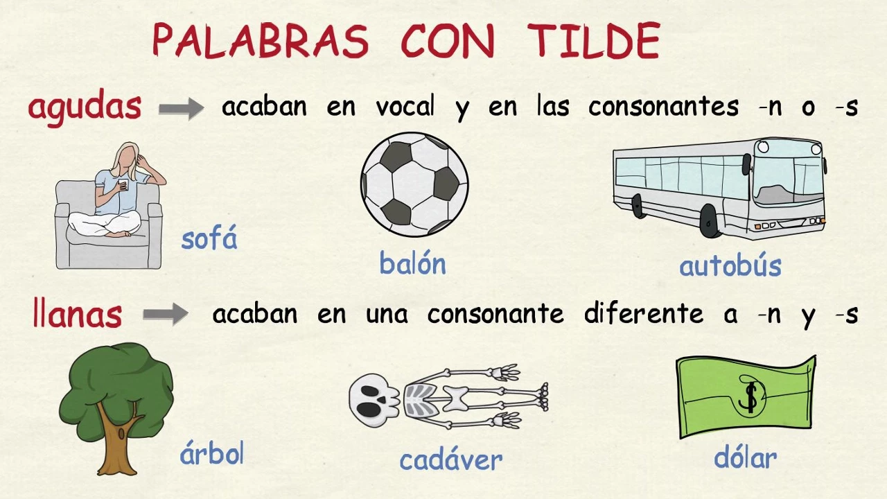 en la antepenúltima sílaba es decir, la tercera por atrás teléfono Y en las sobresdrújulas, el acento está antes de la antepenúltima sílaba de la palabra díganselo En algunos casos, las sílabas tónicas van marcadas con un acento ortográfico que en español se llama tilde Vamos a ver cuándo es necesario que una palabra lleve tilde Las palabras agudas llevan tilde cuando acaban en vocal y en las consonantes n o s bebé mamá sofá balón pantalón autobús Las palabras llanas llevan tilde cuando acaban en una consonante que no es ni n ni s árbol césped cadáver dólar Las