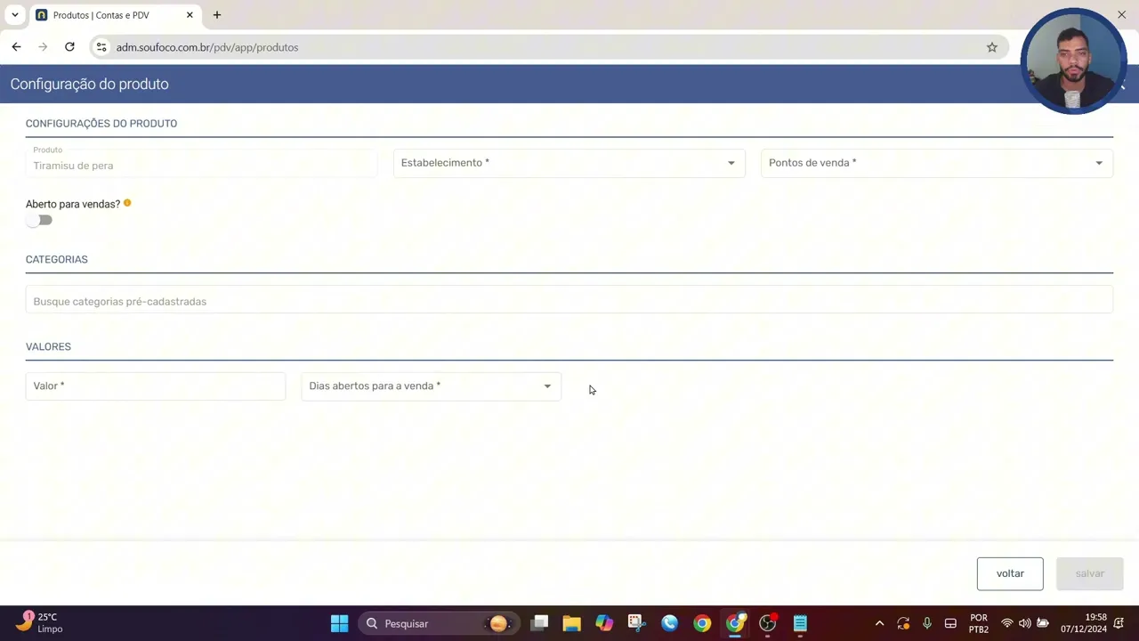 obrigatório mas podemos inserir aqui uma descrição e também podemos inserir uma imagem desse produto clicando em Nova Imagem e podemos fazer aqui o upload em nosso computador aqui eu vou Inserir a imagem do tiramisu aqui eu posso inserir o nome inserir tirul e aqui eu vou salvar e também vou salvar o cadastro desse produto assim que cadastrarmos o produto o sistema libera para configurarmos Então vamos clicar em configurar produto aqui primeiro TPO de cadastro seria o estabelecimento depois vamos inserir aqui em quais pontos de venda esse nosso produto ele é comercializado nesse sentido aqui vou