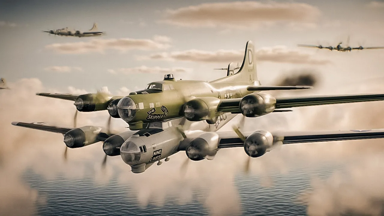 Suddenly they’re spotted. At 22,000 feet the B-17s are jumped and a battle takes place. There are countless enemies and wave after wave of German Me-109 fighters buzz and strafe the American planes.