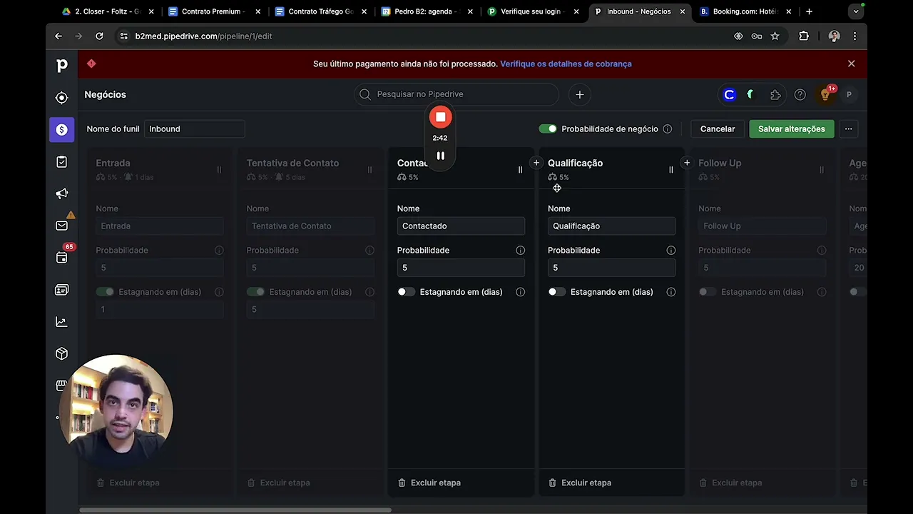 vendido antes dele pagar pagou tá vendido aí é meu mesmo tá certo e eu posso colocar aqui um de repescagem por eu não dou como ganho porque como eu dou com o ganho ele sai do meu Pipe ele vai para outro canto lá então eu prefiro e ele dá o ganho na etapa Eu particularmente gosto de ter uma etapa de vendido que fica mais fácil de visualizar para você quanta receita foi gerada naquele mês tá então aqui são as etapas do seu funil depois eu não sei se esse eleng vai ficar parecendo para vocês aqui