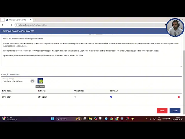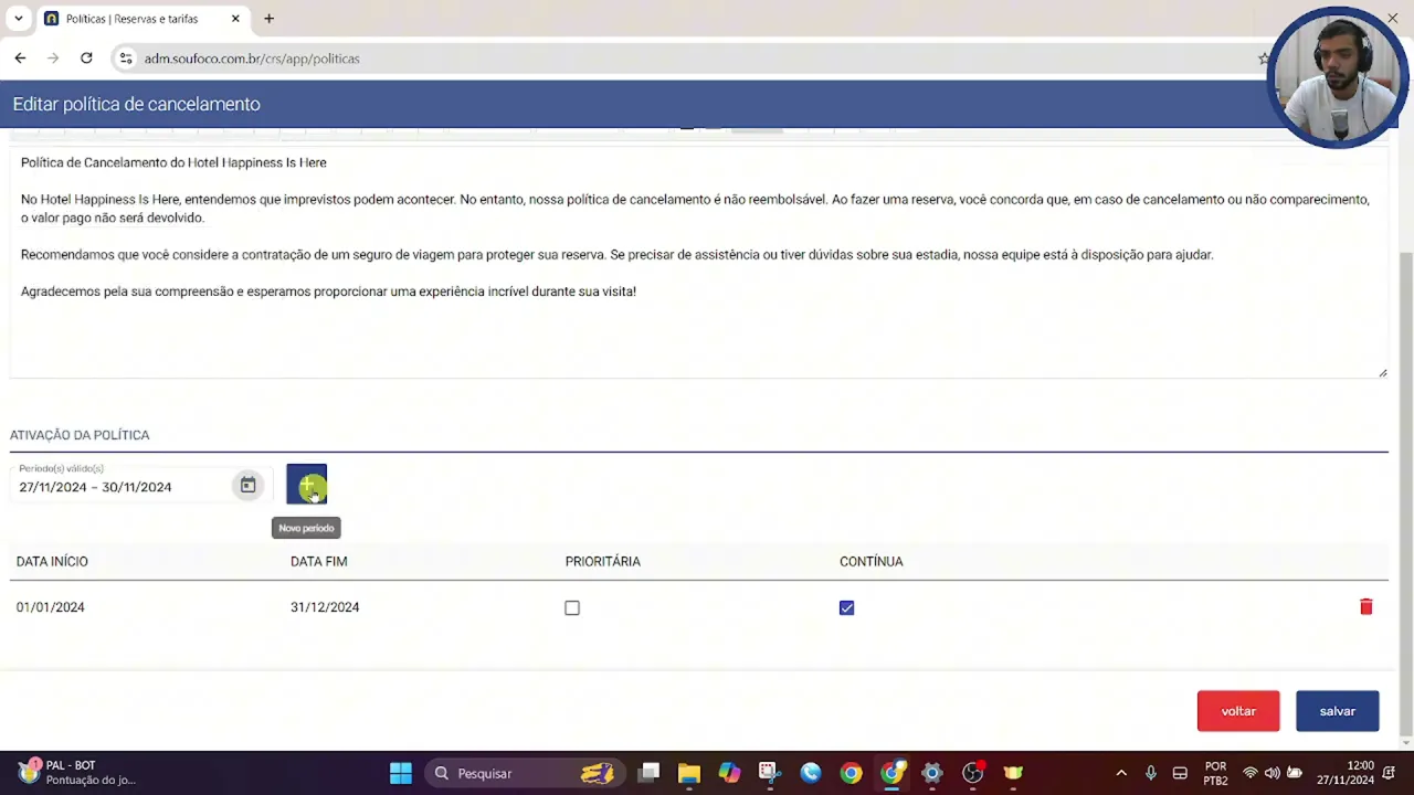 de cancelamento gratuito que também seria descritiva mas com o acréscimo do campo de e antecedência depois que configurarmos aqui a descrição temos que incluir o período de ativação né de validade dessa política então isso aqui eh nos dá a possibilidade de criar mais de uma política em períodos diferentes então poderia criar essa política em um período e depois criar mais outra em um período distinto eh um exemplo seria praticar a política não reembolsável eh na baixa temporada e uma política rebolso Temporada então aqui eu escolho o período inserindo a data de início e a data