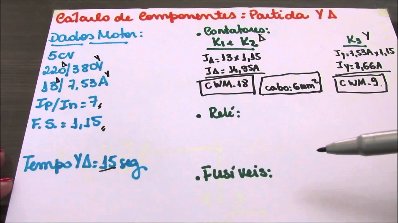 bom essa semana a gente vai ver eh como é que a gente faz os cálculos para os componentes da partida estrela triângulo eu trouxe o mesmo motor que a gente viu na semana passada que a gente fez os cálculos de componente de partida direta eu trouxe o mesmo motor pra gente ver se vai dar alguma diferença e onde vai dar alguma diferença tá então lembrando Quem ainda não consegue e entender o que que é cada dado da placa de motor Eu tenho um vídeo no canal vou deixar o link aqui embaixo e explicando passo a passo como que a gente entende né como que a gente lê uma placa de motor até a gente conseguir tirar o máximo de informações possíveis Então a gente tem aqui um motor de 5 cavalos ele é um motor obviamente estrela triângulo porque a gente vai est utilizando uma partida estrela triângulo então ele tem uma e duas tensões defasadas em ra3 a a tensão de triângulo 220 a tensão de estrela 380 v e ele tem também dois valores de corrente cada valor de corrente é correspondente a um dos fechamentos Então vai sempre na ordem se a primeira tensão é triângulo a primeira corrente é triângulo se a segunda tensão é estrela a segunda da corrente também é estrela IP sobre N significa que esse motor aumenta sua corrente em até sete vezes na hora da partida e o fator de serviço que significa que a gente pode jogar 15% de sobrecarga na corrente e na potência desse motor que ele vai ter um funcionamento normal a gente vai mudar a primeira coisa aqui ó o tempo da partida na aula passada a gente utilizou um tempo de 5 segundos como a gente passou essa partida pra estrela triângulo geralmente a gente utiliza um tempo de 15 segundos para ter a certeza do tempo que vai utilizar Só se a gente fizer o uso do tacômetro na partida para ver quando deve ser a comutação do Tri do estrela para o triângulo então a gente posiciona o tacômetro o motor deu 90% da da sua RPM nominal é é naquele tempo que a gente precisa fazer a comutação de estrela para triângulo no vídeo do funcionamento da partida estrela triângulo tem explicando tudo isso também tá Então vamos lá primeira coisa os contatores que que a gente tem que separar lembra que na partida estrela triângulo a gente utiliza três contatores em um certo momento a gente utiliza k1 e K3 para fazer a partida quando a gente utiliza partida em Estrela daí um tempo a gente tira K3 fora e bota K2 no lugar então o funcionamento k1 e K3 é para o fechamento estrela o funcionamento de k1 e K2 é para o fechamento triângulo tá no estrela a corrente é mais baixa então o meu contator k1 eu vou considerar como se ele fosse da corrente mais alta porque ele vai ser utilizado tanto na corrente mais baixa quanto na mais alta e ele tem que dar conta dos dois valores de corrente então eu já vou calcular de forma que ele suporte a corrente mais alta que a corrente do Triângulo então por isso que eu coloquei ele junto do K2 aqui então esses dois aqui são para funcionamento em triângulo e o K3 para fazer aquele curto de fechamento em Estrela primeira coisa que a gente tem que fazer eh vou trabalhar aqui a partida desse motor é em Estrela então na partida quem que a gente tem eh funcionando k1 e K3 vou calcular só sobre K3 porque o k1 ele também funciona na corrente mais alta junto de K2 então eu vou ter que utilizar a corrente desse motor em Estrela olhando pela placa corrente em Estrela 7,53 A então eu tenho uma corrente de 7,53 e tem um fator de serviço de 1. 15 é só eu multiplicar os dois então a corrente em Estrela 753 x 1. 15 8,66 a Então essa é a corrente que eu tenho que procurar no contator eh já no nos contatores para triângulo o que que eu vou utilizar eu vou utilizar a corrente para triângulo então a corrente vai ser a corrente para triângulo que é 13 vezes o fator de serviço que é o mesmo 1.