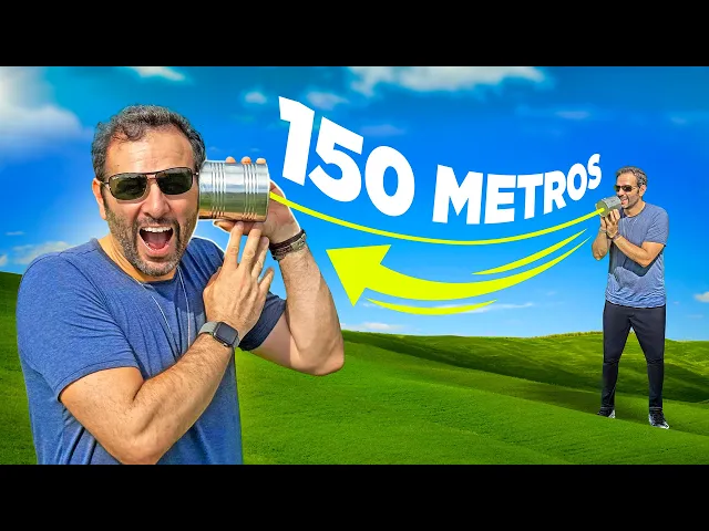 segundo de atraso então na prática quando ele falar lá o som vai chegar primeiro pela lata depois pelo ar quer dizer se ele chegar mesmo pela lata né 150 m é muita coisa cheguei Nossa o arame fica muito pesado caramba não dá para esticar vai estourar o fundo da lata fica muito mais pesado do que eu imaginava não sei se vai dar que é muito a barriga que o fio forma é imensa de 150 m então ele força muito para baixo O Dani agora tá fazendo a outra ponta lá da lata ele tá conectando a