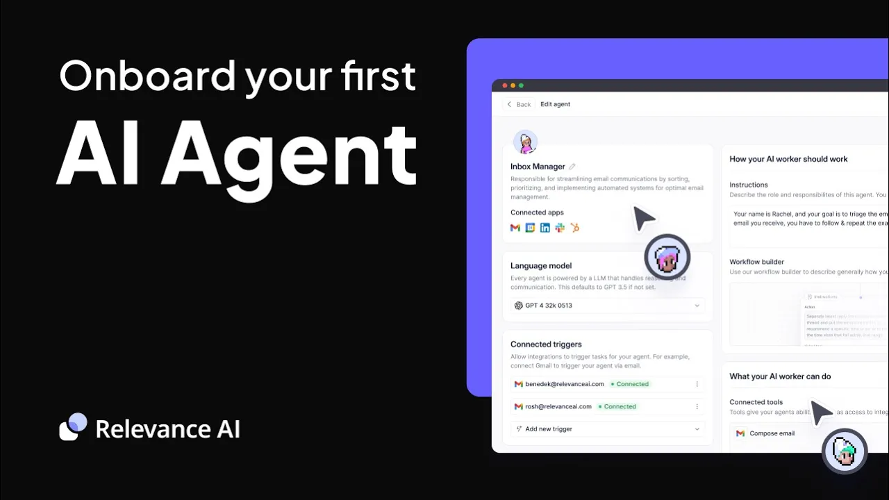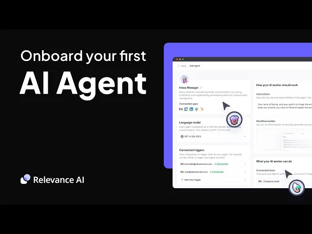 offload tedious and repetitive work to autonomous AI agents relevance AI agents are much more than conversational assistant they're another pair of hands on your team they take action working around the clock to plan and reliably execute tasks on autopilot the more you use them the better they get equip your agents with AI tools to give them skills and specialize them for any task from personalizing outbound sales emails to onboarding new CL clients answering customer FAQs or automatically communicating updates whatever you can dream up you can create in the relevance platform no coding required integrate your