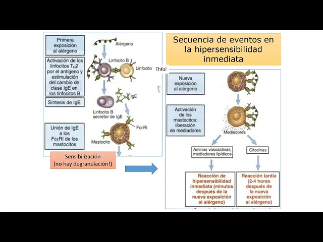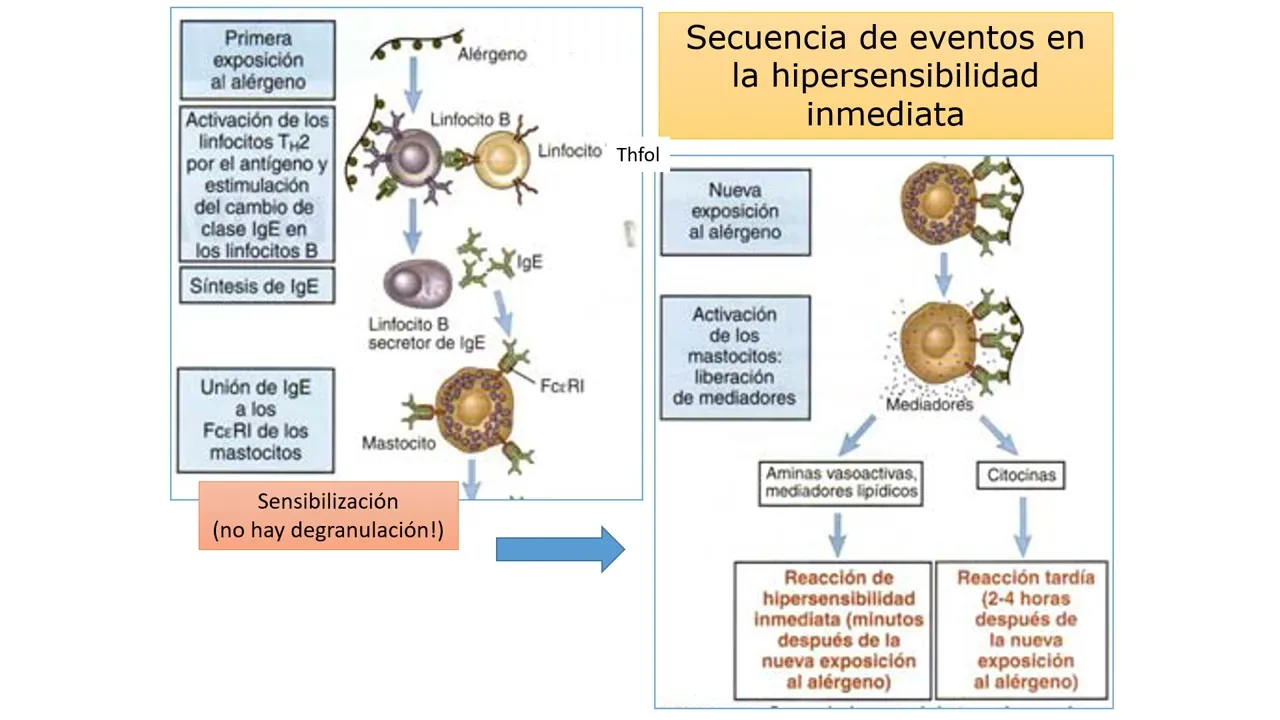 la pantalla el mastocito se activa y de granula liberando los mediadores que producen la respuesta temprana histamina prostal andinas leucotrienos que generan vasodilatación que aumentan la permeabilidad en en los tejidos y que induce la broncoconstricción y también libera las citoquinas que son responsables de los procesos tardías o la fase tardía de la hipersensibilidad de tipo 4 en la cual se caracteriza por estar formada por una población rica en células tper 2 las cuales eh liberan interlu 4 que aumentan la permeabilidad de la membrana aumenta la expresión de las moléculas de adhesión y de interlu 5