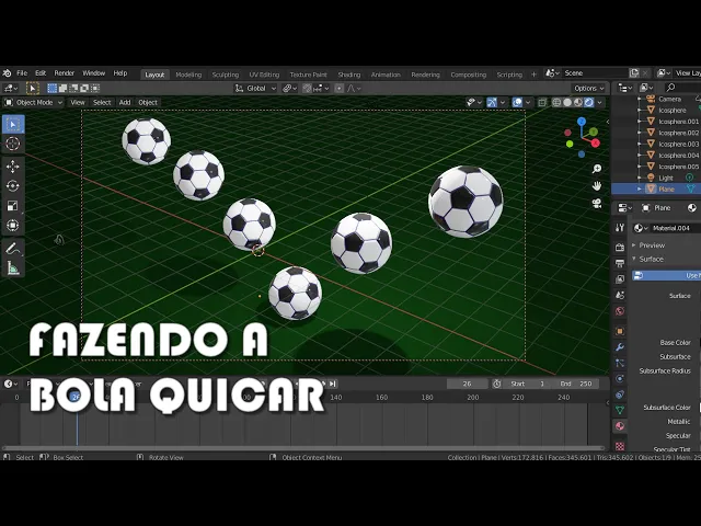 em pouco tempo eu postei aqui no canal tutorial onde eu demonstrei como é que a gente pode gerar de forma prática um objeto em forma de uma bola se você lembrar em nós geramos esse objeto utilizamos alguns recursos de materiais para atingirmos essa esfera aqui que a nossa bola de futebol surgiu uma dúvida aqui como é que eu faço agora para fazer essa bola quicar junto a um efeito eu vou clicar aqui se vocês quiserem ver o vídeo desse tutorial onde a gente pode criar a bola eu vou deixar aqui em cima o link para