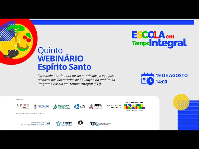 Oi beleza então então sejam bem-vindos todos e todas as secretários e secretárias técnicos e técnicos em educação professores professoras diretores de escola os nossos convidados e convidadas eu sou o professor luí Alexandre da uf do Centro de Educação Física eh e esse é o quinto webinário Estadual da ação continuada de secretários e equipes técnicas das secretarias de educação para o programa escola em tempo integral no Espírito Santo essa atividade se insere no esforço do Ministério da Educação da Secretaria de Educação Básica Diretoria de políticas e diretrizes da educação integral básica e da Coordenadoria geral da